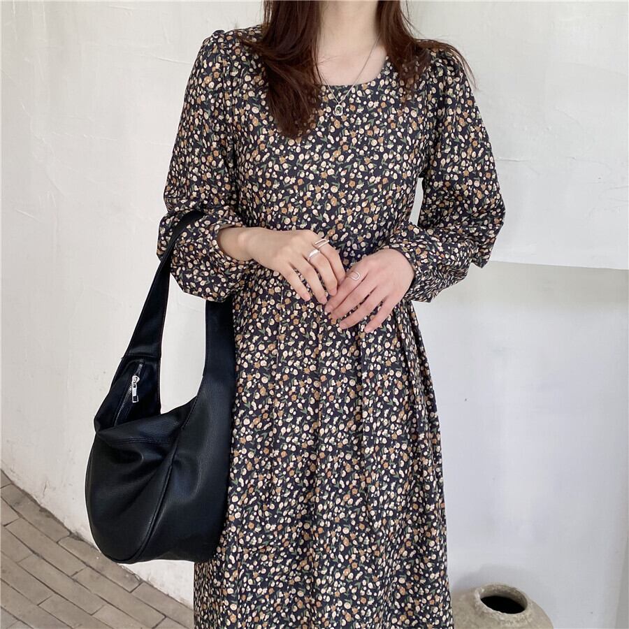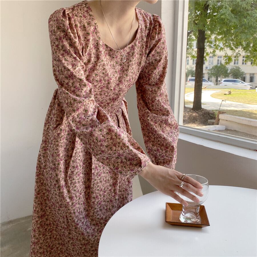 スリムハイウェストウェストプリーツコーデュロイフローラル長袖スリーブドレス ロング 花柄 スクウェア ICC_レディース12568032864
