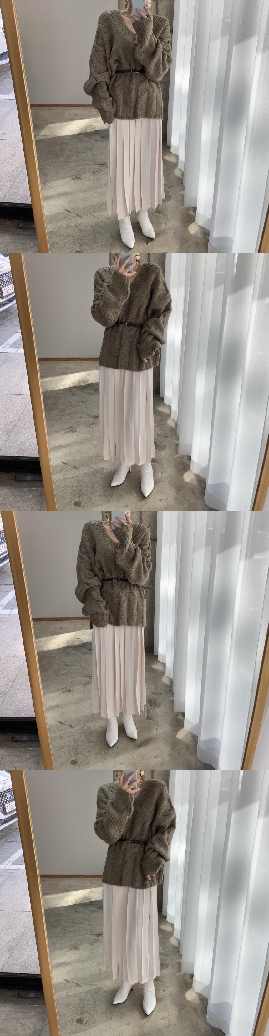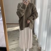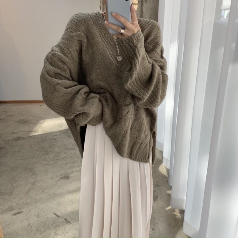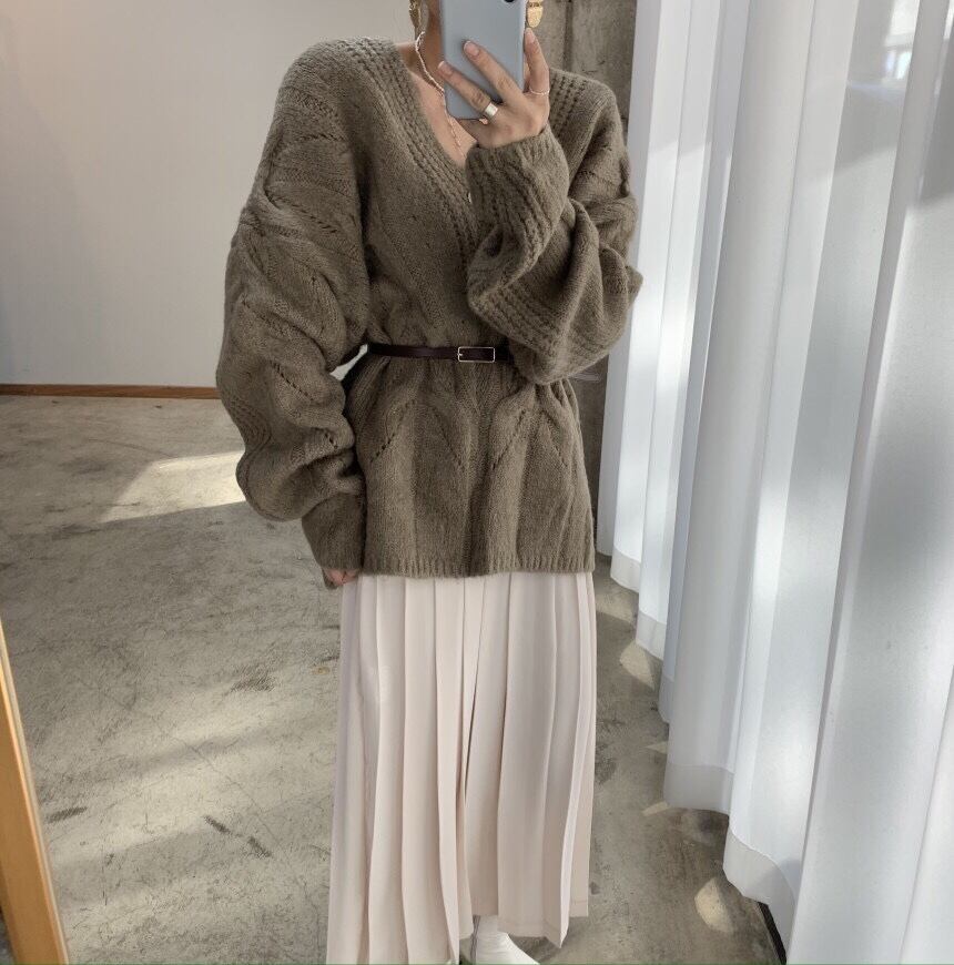 オータムウィンタースタイルVネックパターンニットセーター ハイウェストウェストプリーツスカート 秋物 冬物 ICC_レディース46559040714