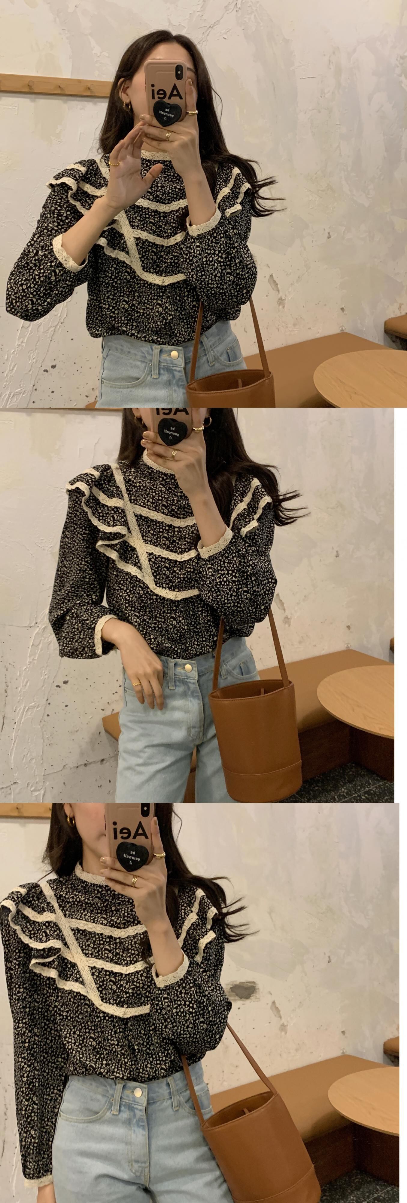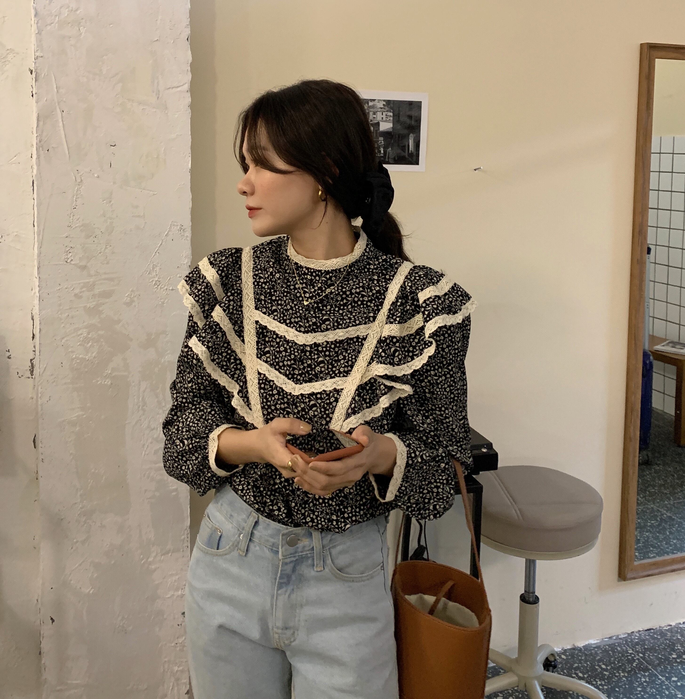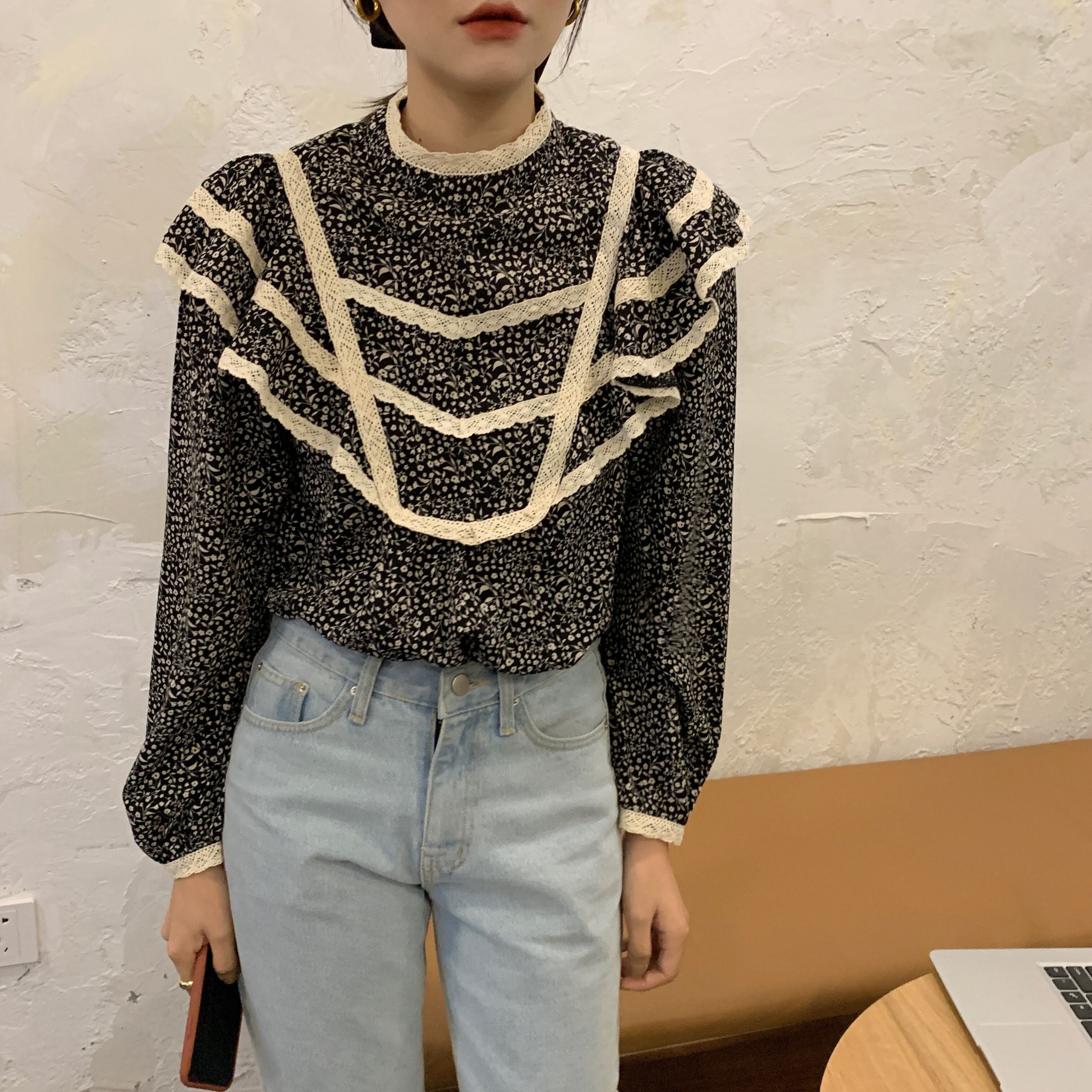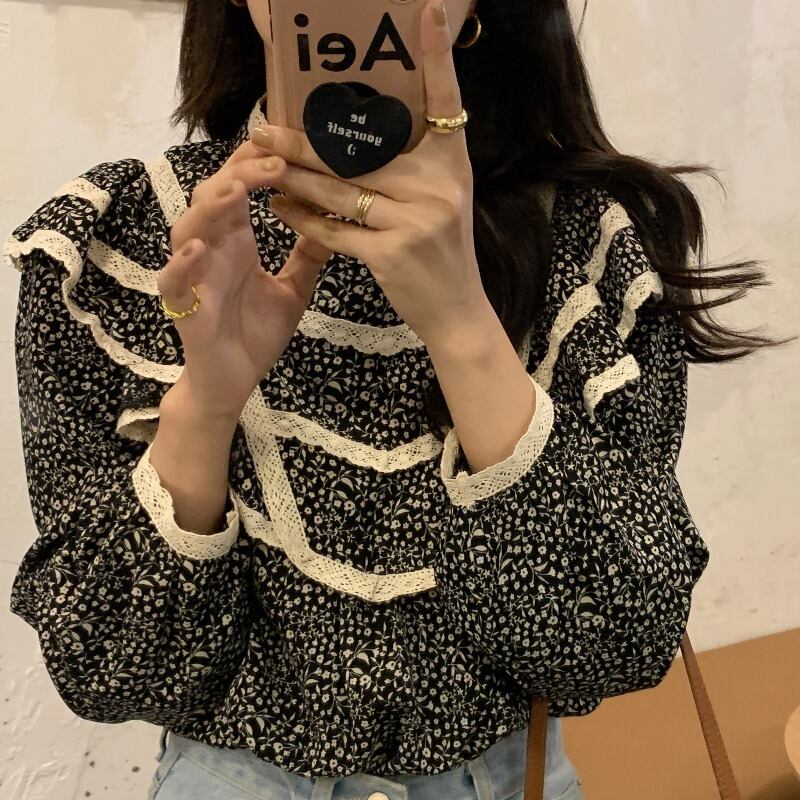 オータムスタンダードフローラルレースカラールーズシャツ トップス レディース ロング レトロ 秋物 花柄 ステッチ ICC_レディース81007518167
