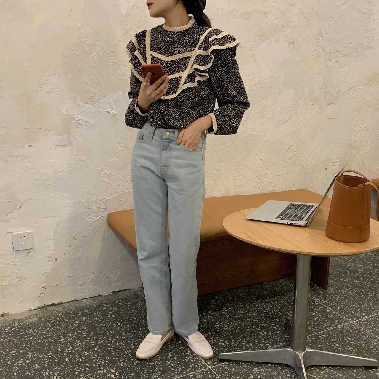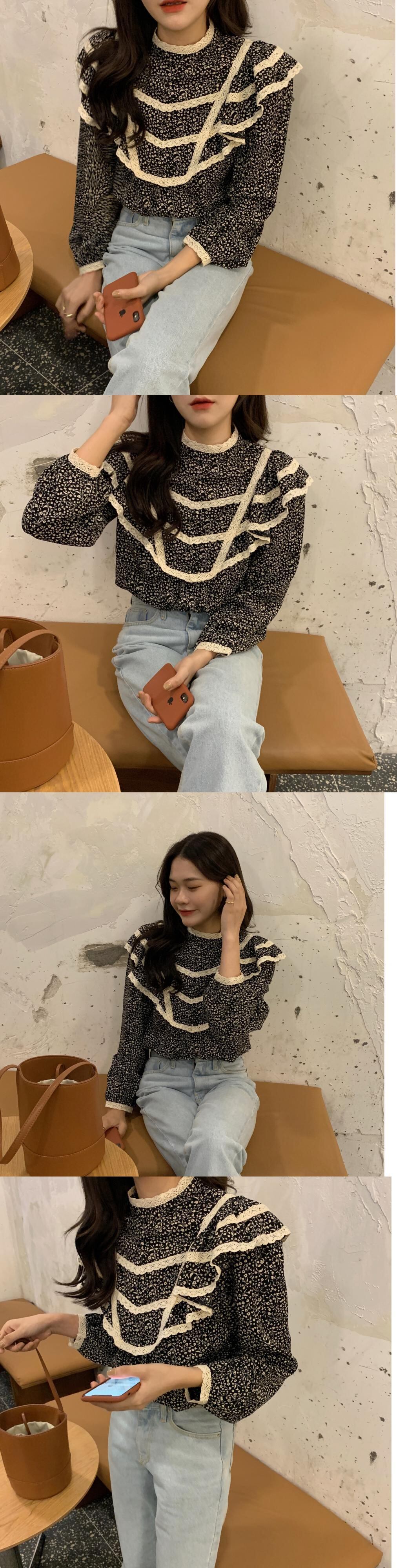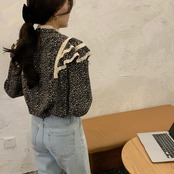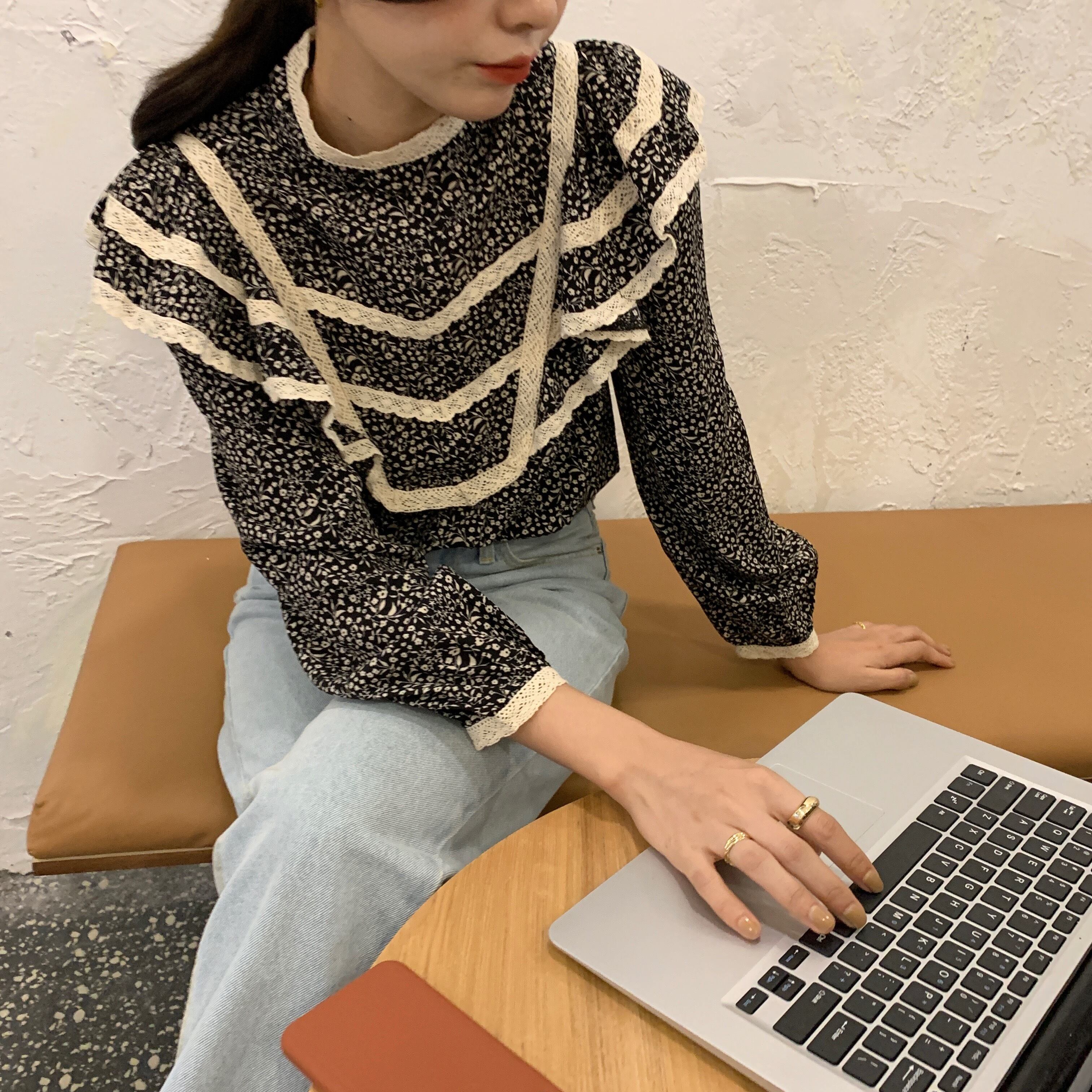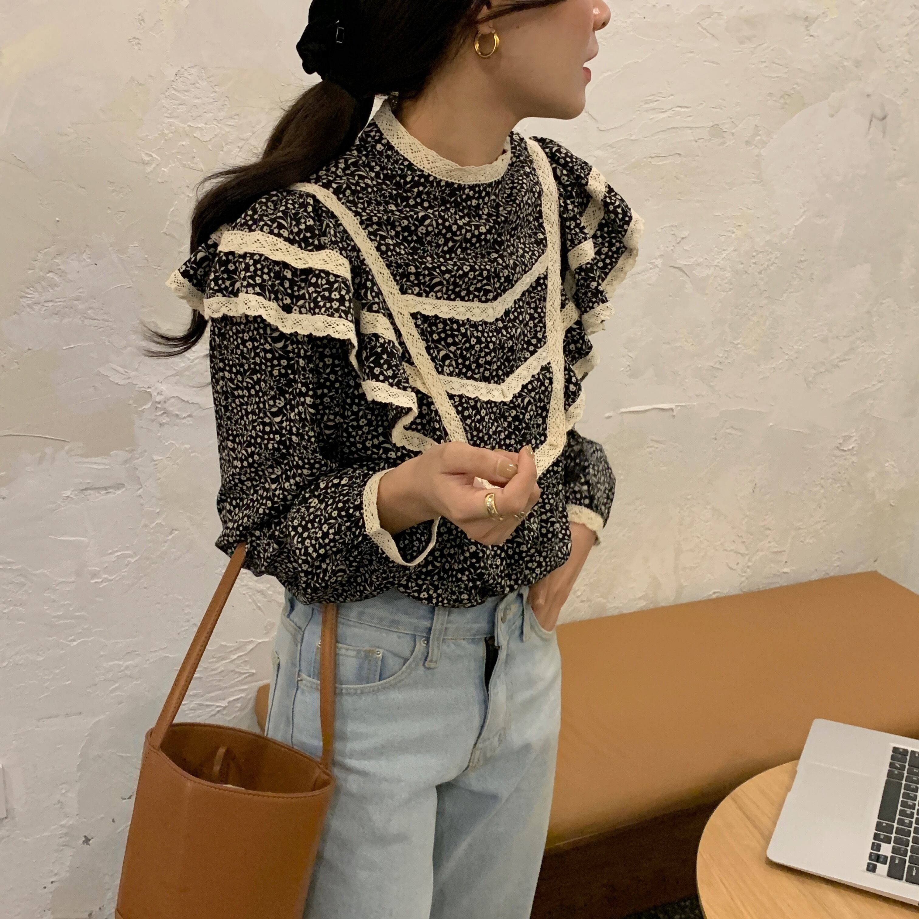 オータムスタンダードフローラルレースカラールーズシャツ トップス レディース ロング レトロ 秋物 花柄 ステッチ ICC_レディース81007518167