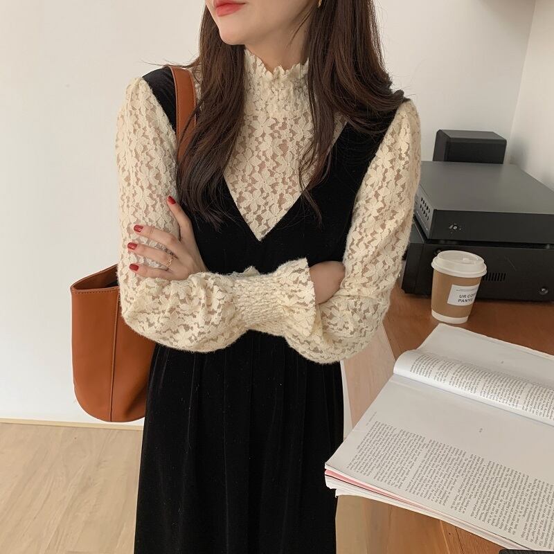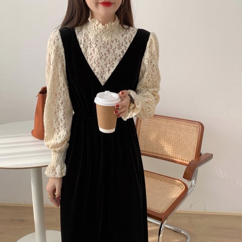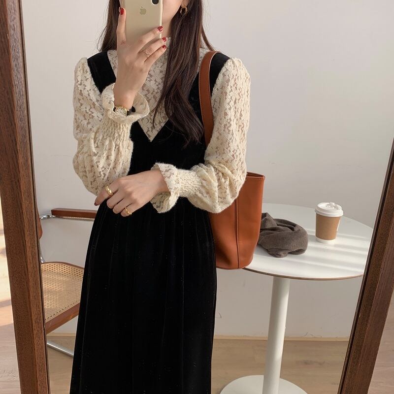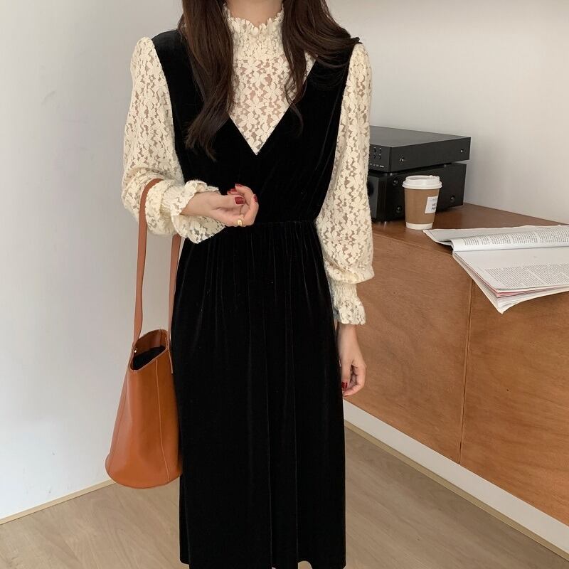 Vネックレーススリーブゴールドベルベットドレス 長袖オータムウィンターハイウェストウェスト薄手スカート レディース ロング 秋物 冬物 ステッチ ICC_レディース88542495055