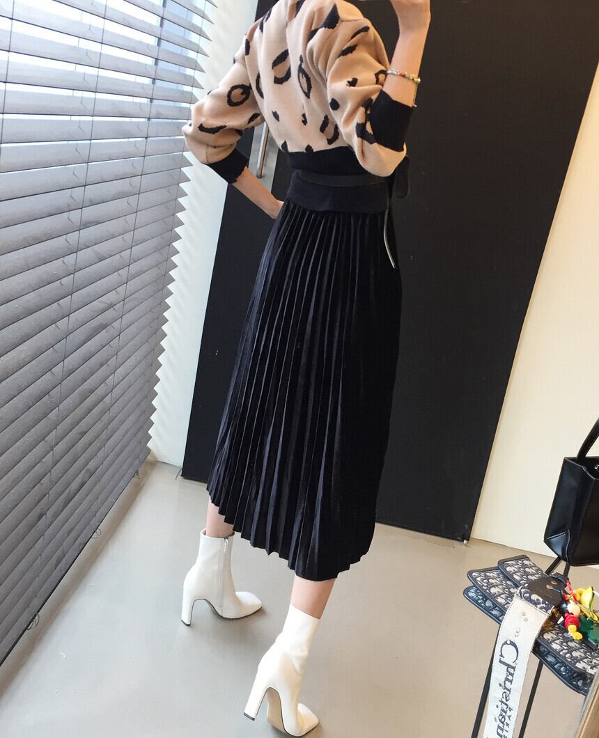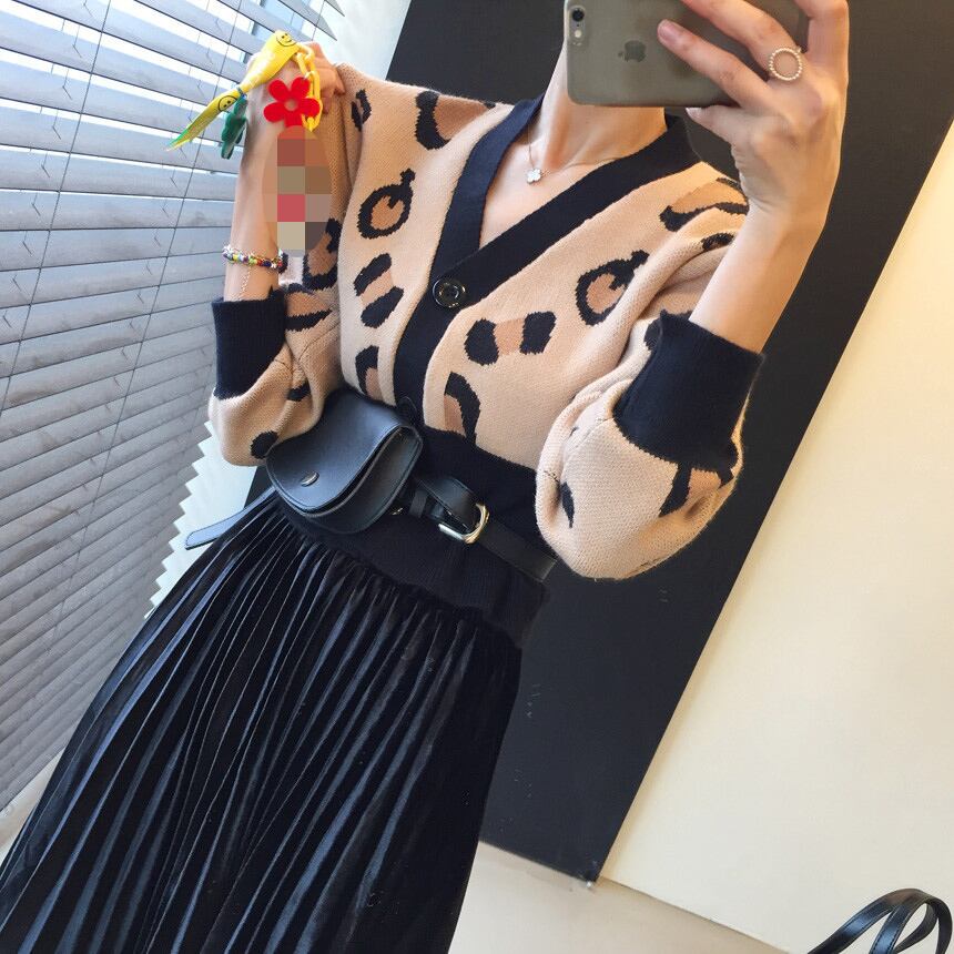 オータムウィンターレオパードプリント柄ニットカーディガンセーター ハイウェストウェストプリーツスカート ロングレディース 秋物 冬物 ICC_レディース5180889044
