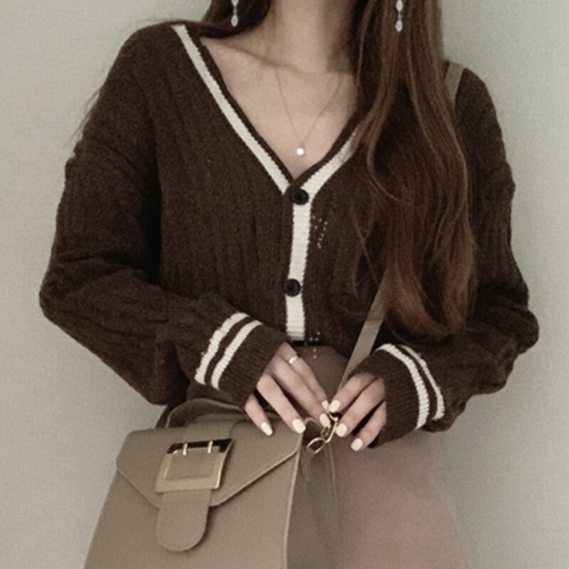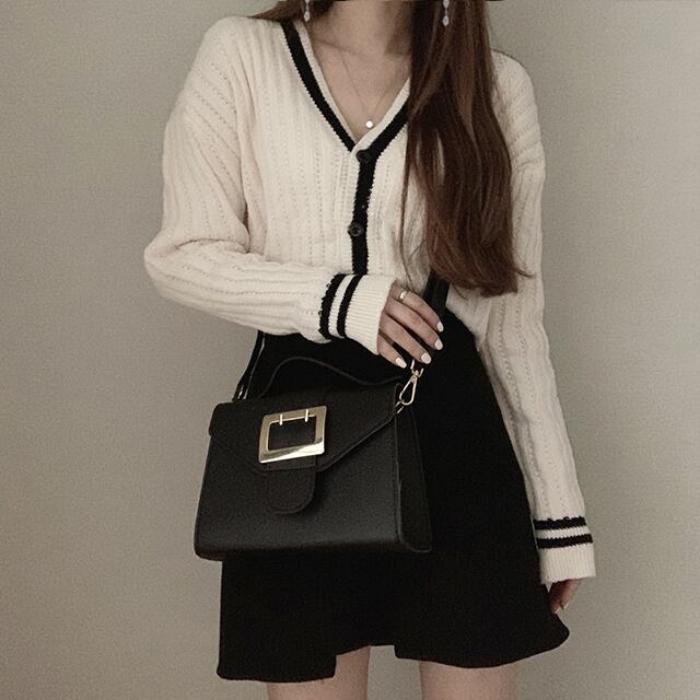 オータムウィンターVネックブラックホワイトカラールーズニットカーディガンセーター レディース ロング 秋物 冬物 ICC_レディース3298109297