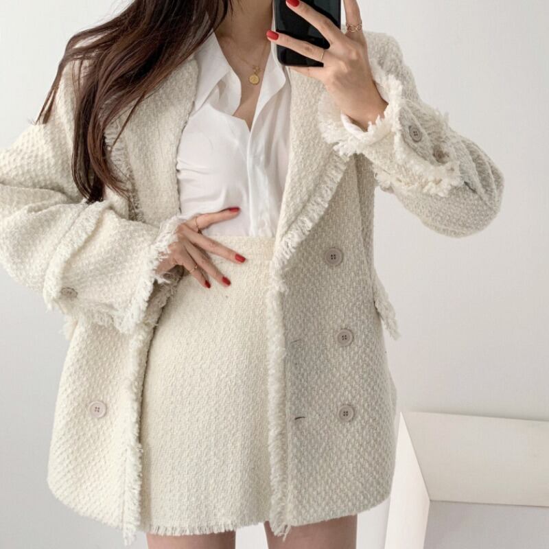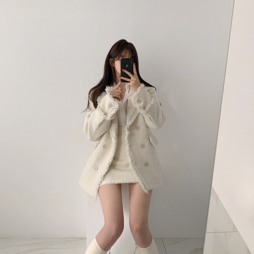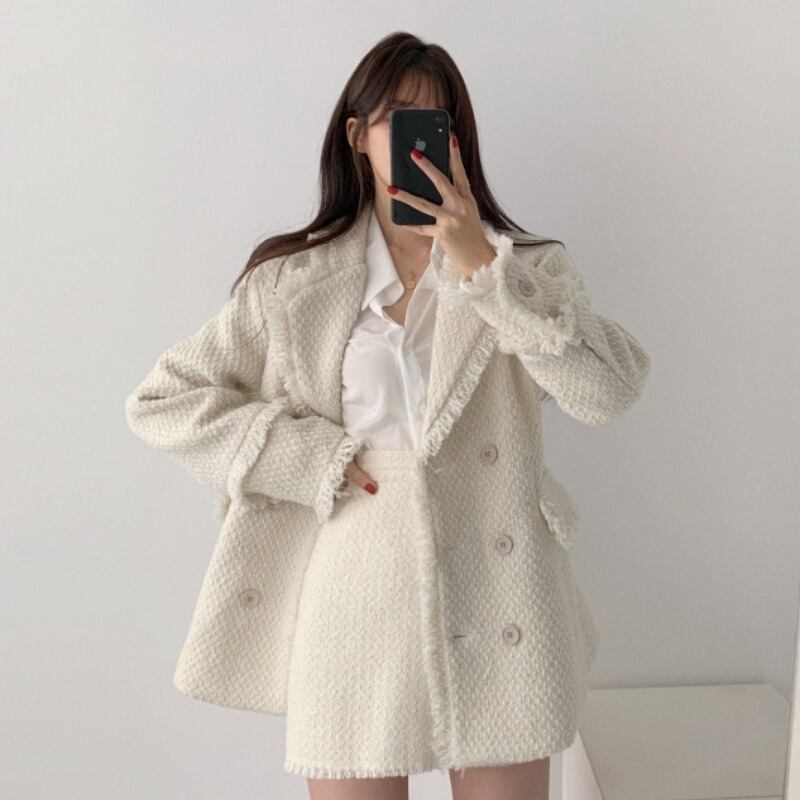 色:ベージュコート,黒いジャケット,白いスカート,黒スカート