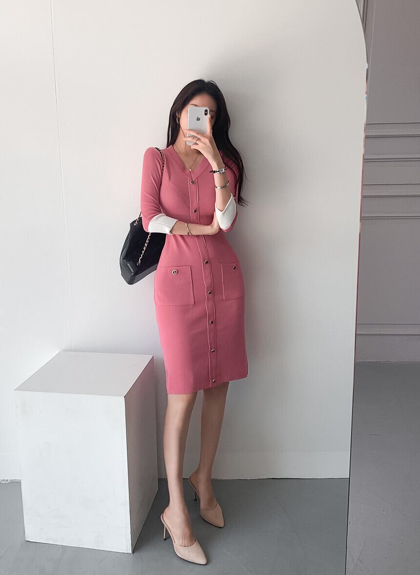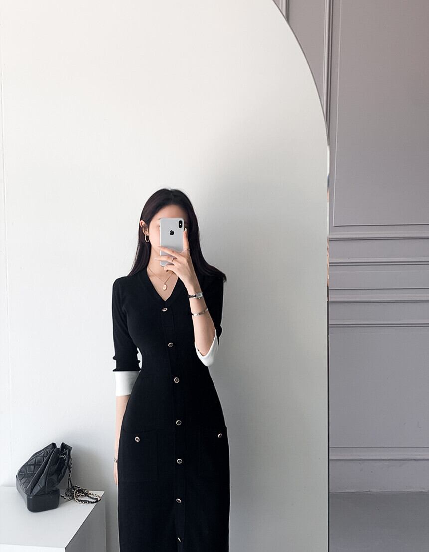 スタイルスタンダードVネックスリムハイウェストニットドレス レトロ ウィンター 冬物 ICC_レディース31856377314