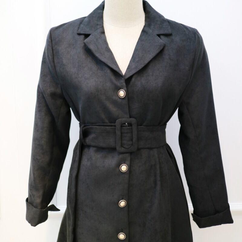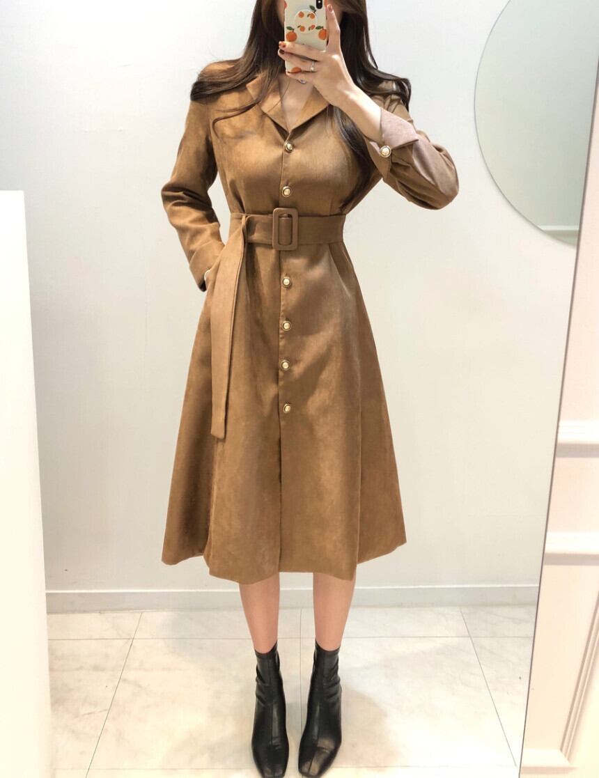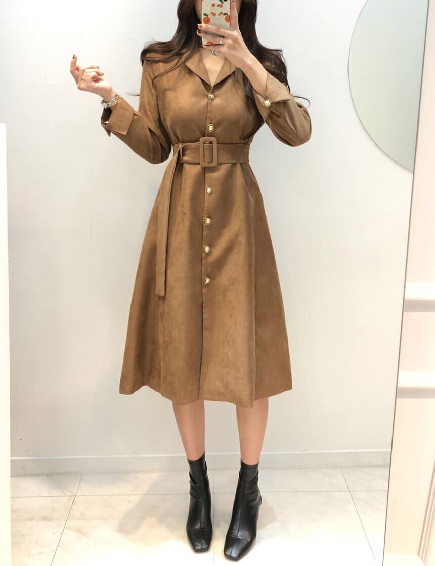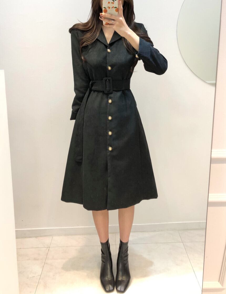 スタンダードカラーシングルパールバックルソリッド ドレス レディースオータムウィンターロングスカート レトロ 秋物 冬物 真珠 ソリッドカラー ICC_レディース75189358132