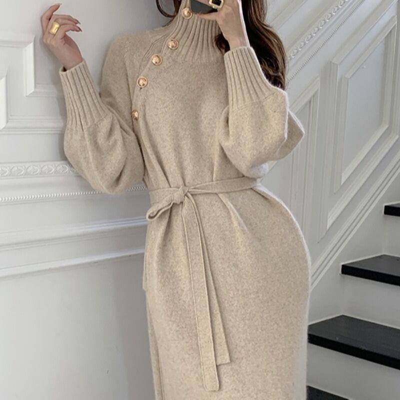 オータムウィンタースタンダードボタンセーター ドレス レースウェストニットレディース レトロ 秋物 冬物 ICC_レディース2233191226
