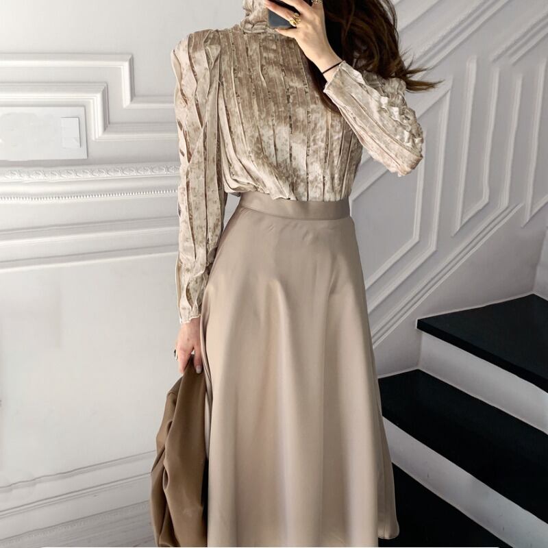 オータムウィンタースタイルベルベットシャツ サテンスカート ロング 秋物 冬物 ICC_レディース49198822195