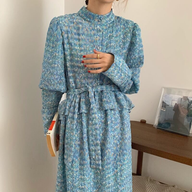 オータムウィンターカラーロングフローラルドレス ウェストスカート レース 秋物 冬物 花柄 レースアップ ICC_レディース41297125970