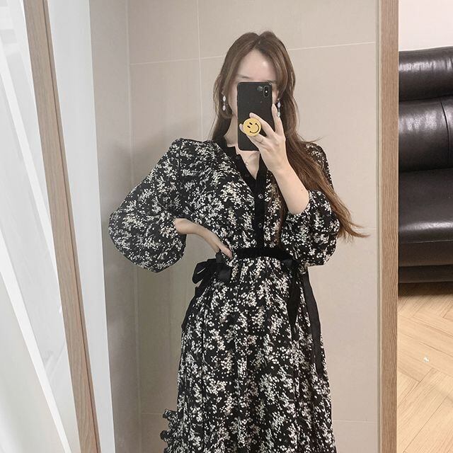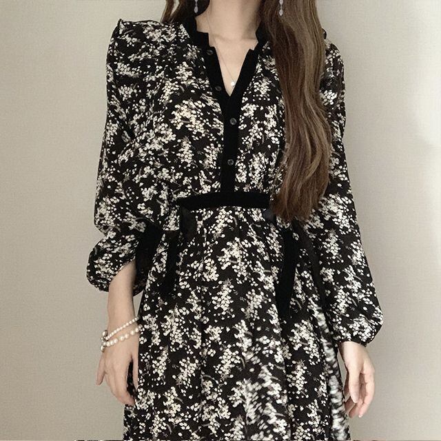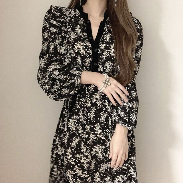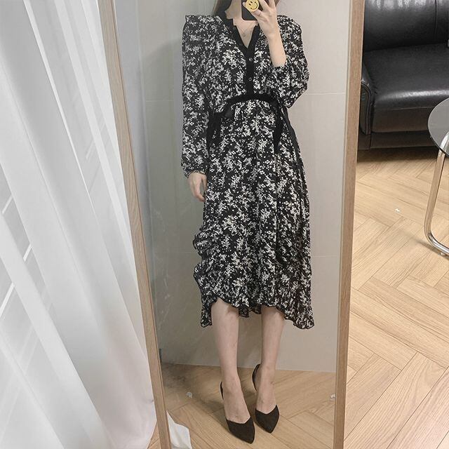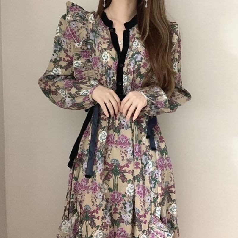 スプリングオータムフローラルカラースカート 薄手ドレス レディース ロング 春物 秋物 花柄 ICC_レディース86394774083