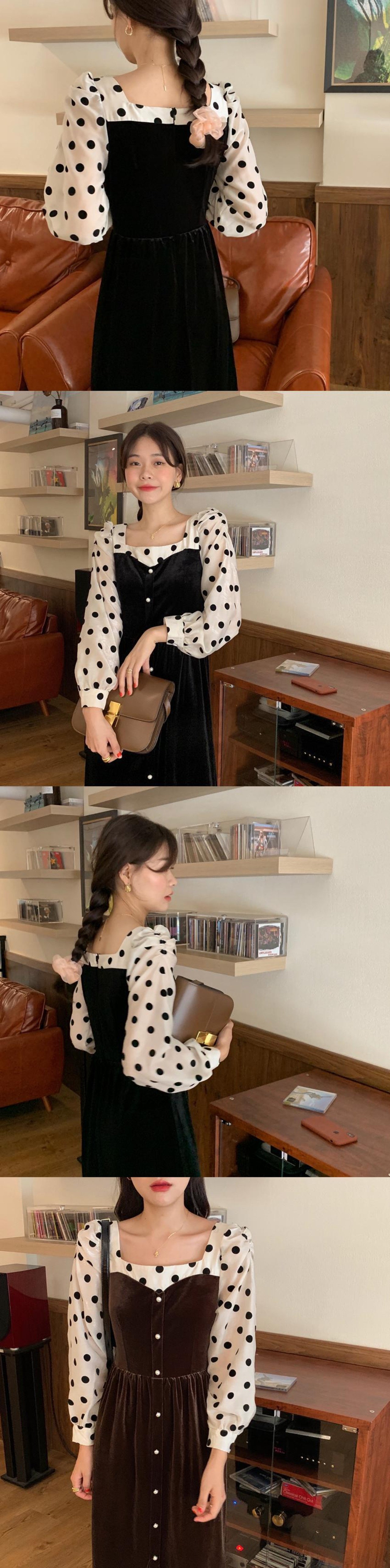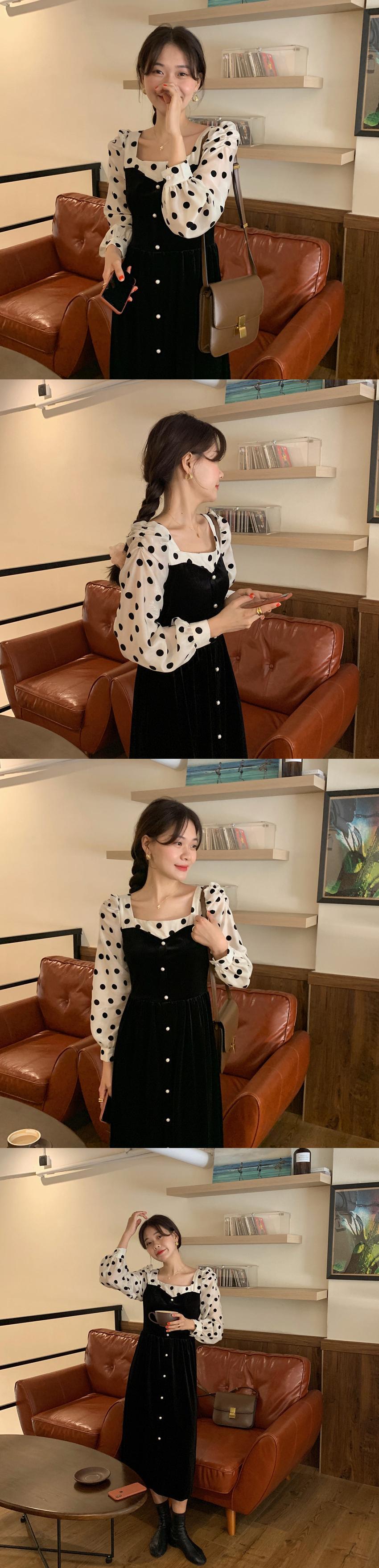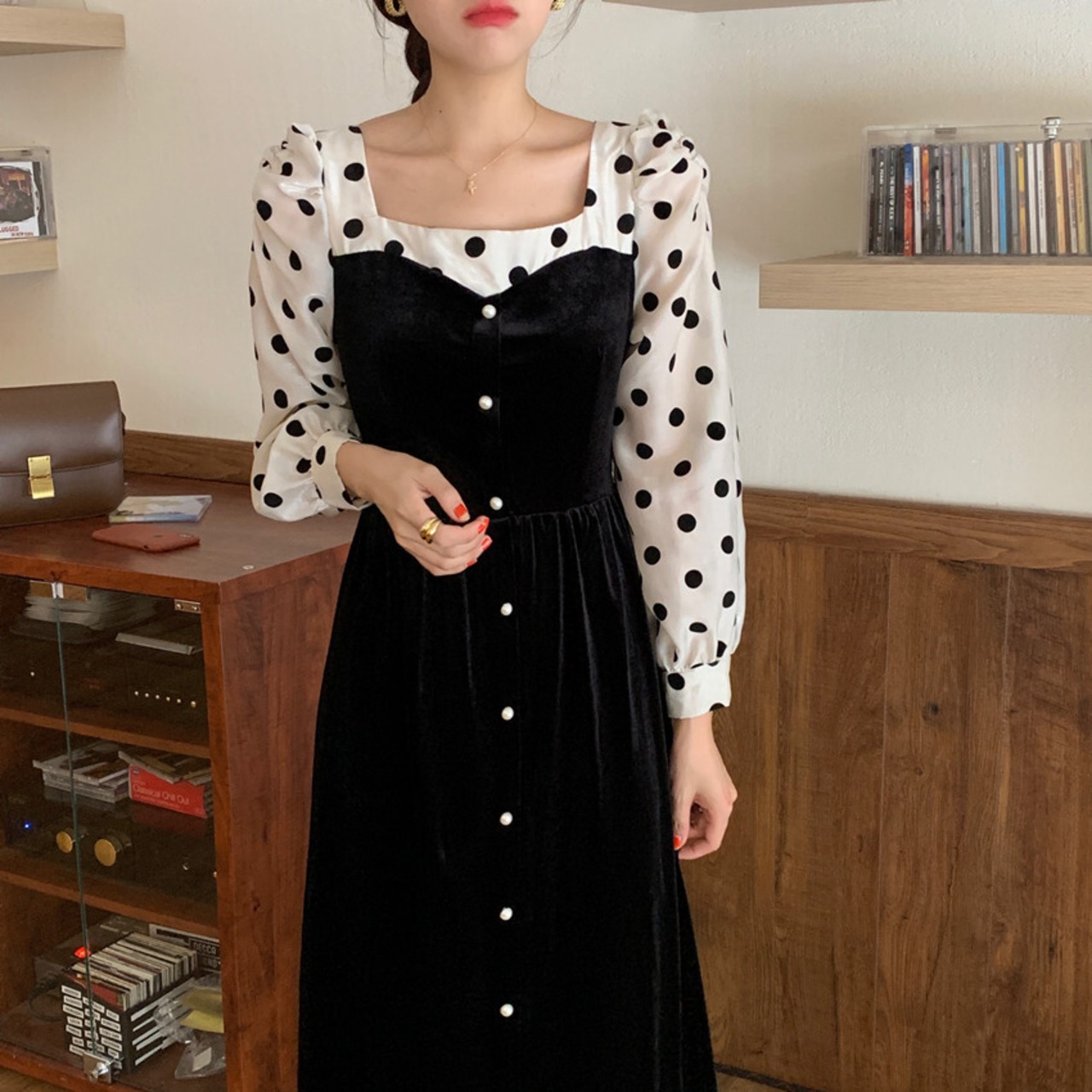 水玉ドレス オータムウィンタースタイルスリーブベルベット 秋物 冬物 スクウェア ステッチ ICC_レディース47818683024