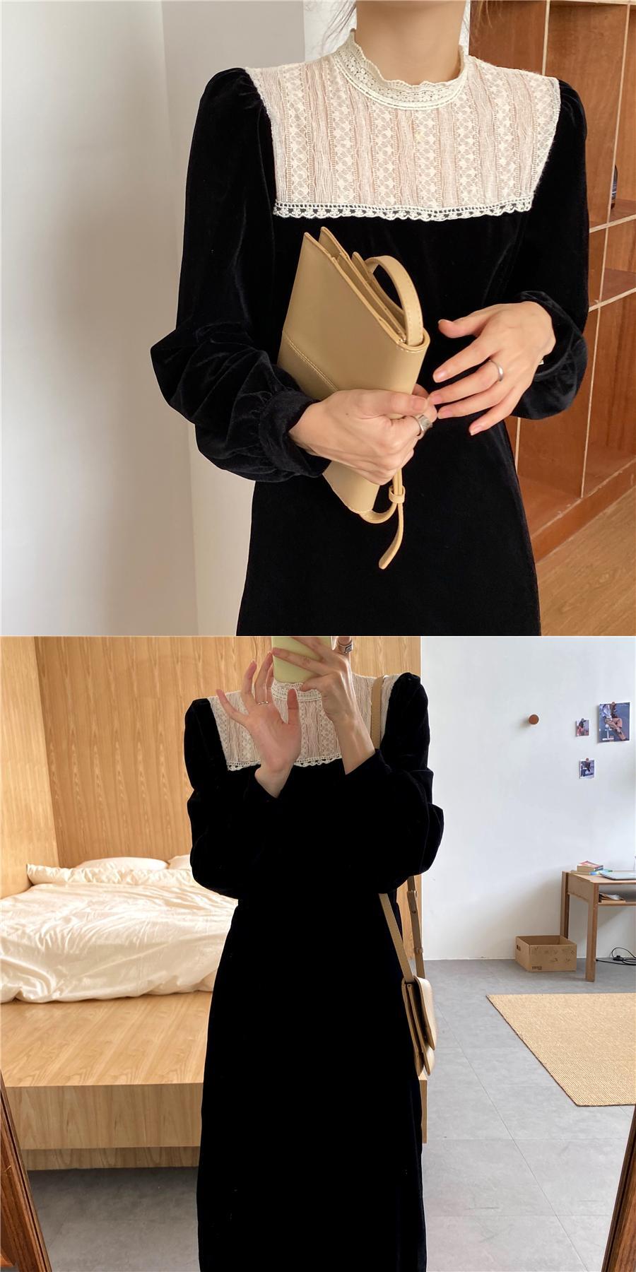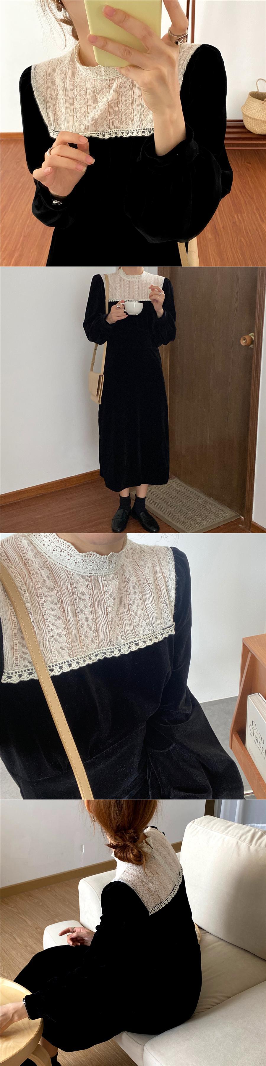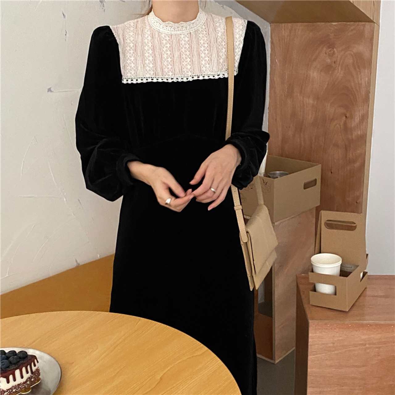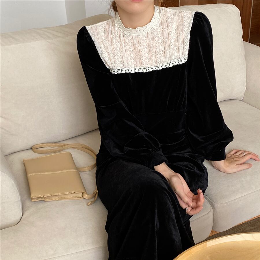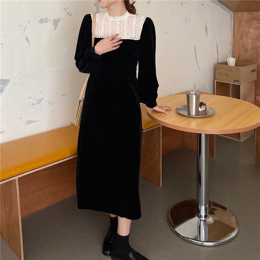 オータムウィンターカラーレース薄手ロングブラックゴールドベルベットスタイルドレス 秋物 冬物 ICC_レディース32341802512