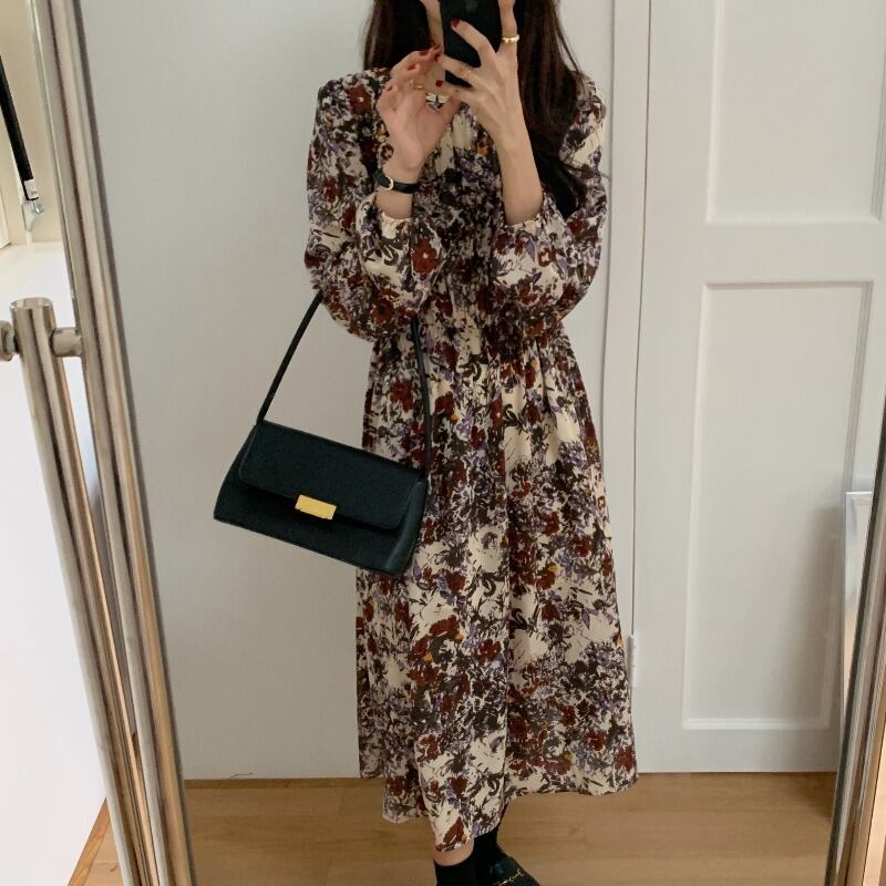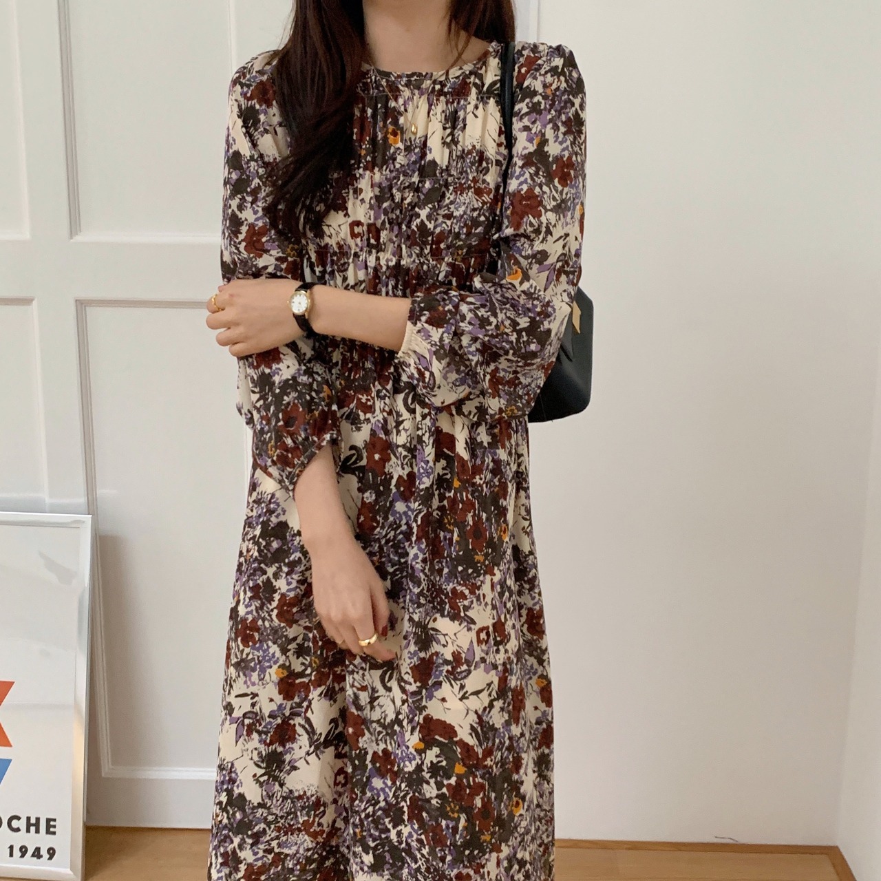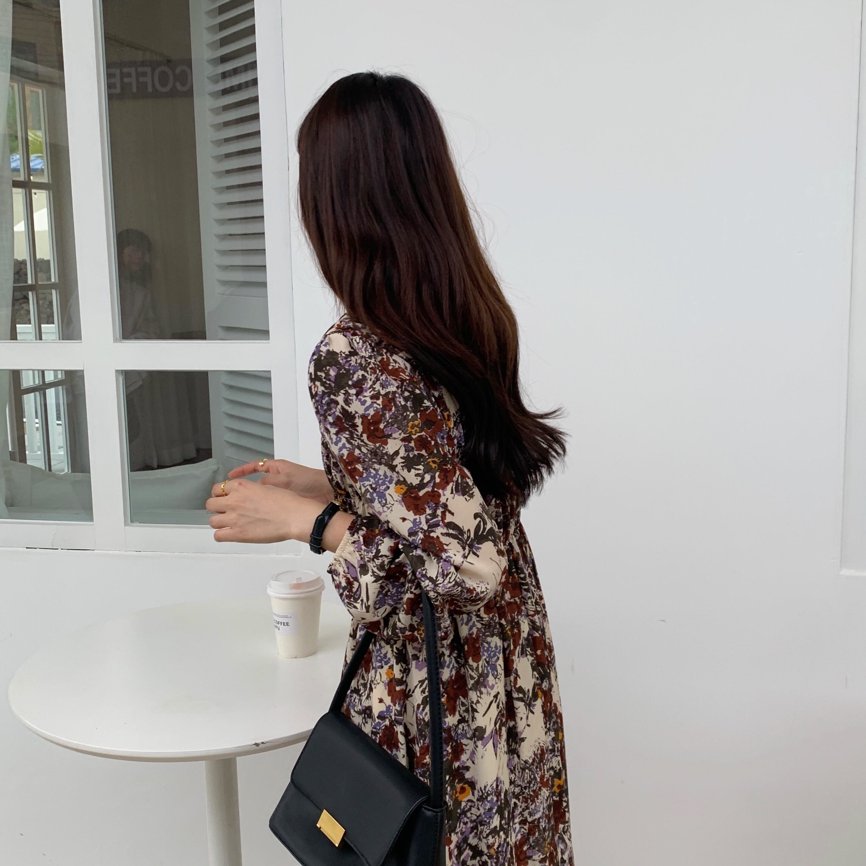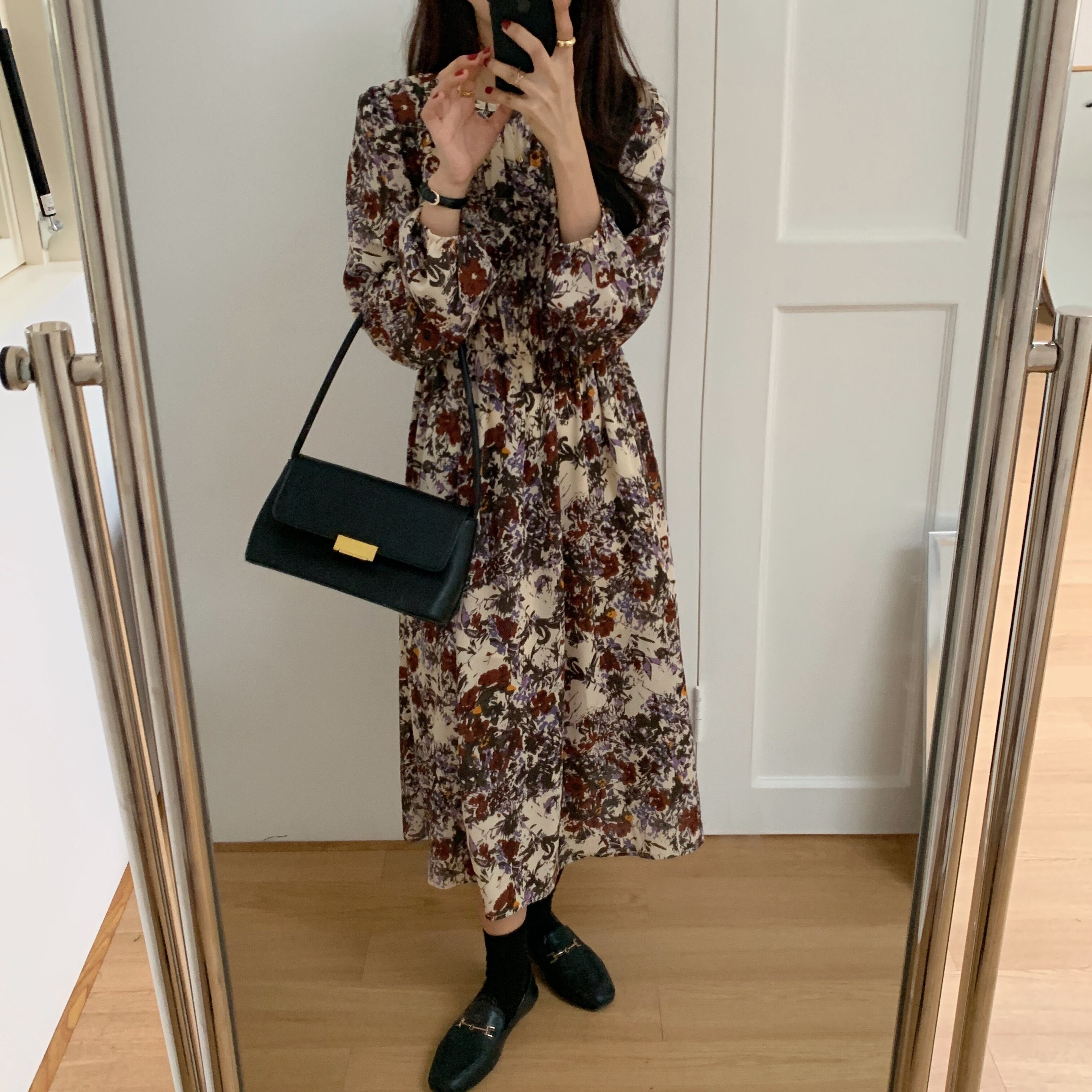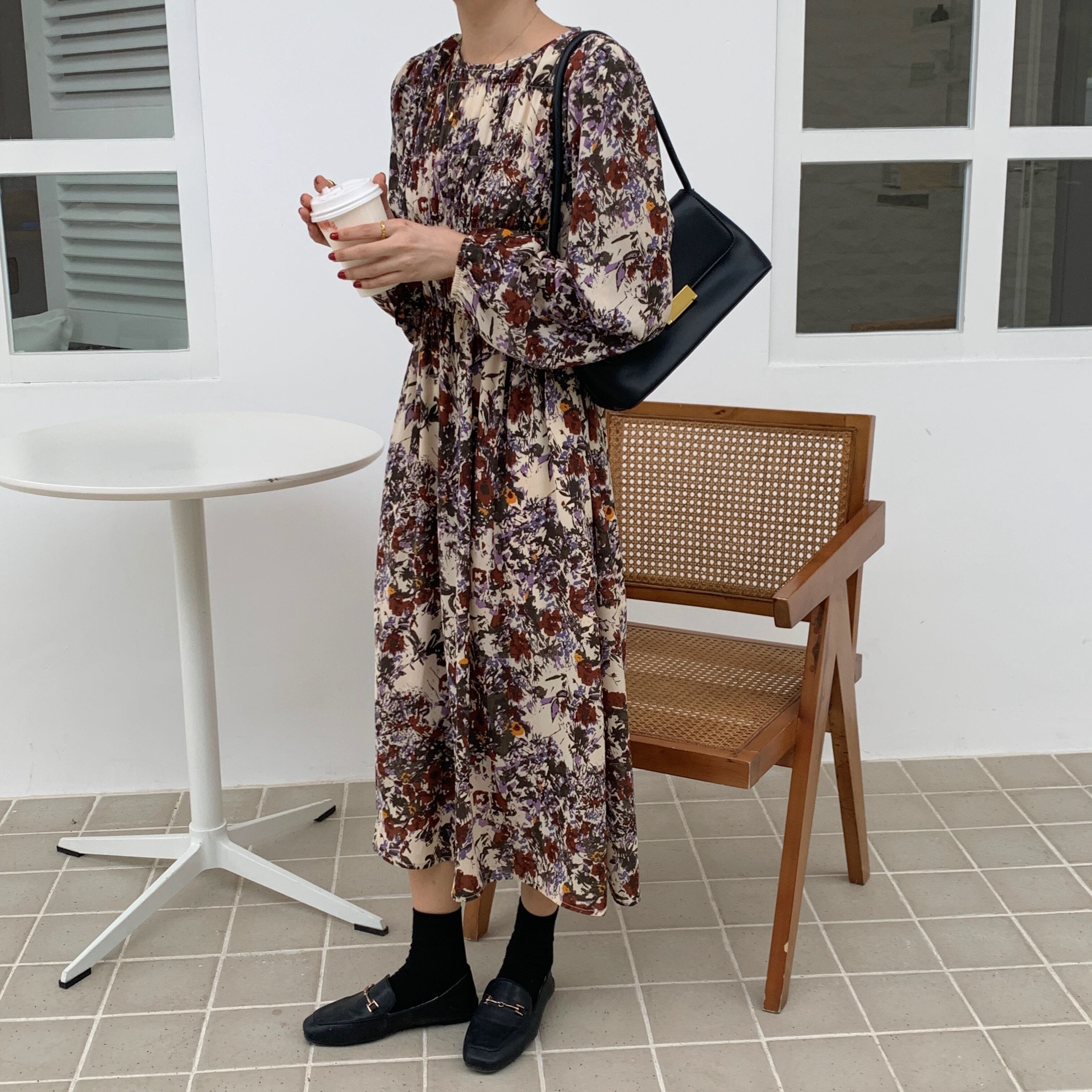 オータムウィンタースタンダードウェストシフォンフローラルドレス ロング レトロ 秋物 冬物 花柄 ICC_レディース44375909783