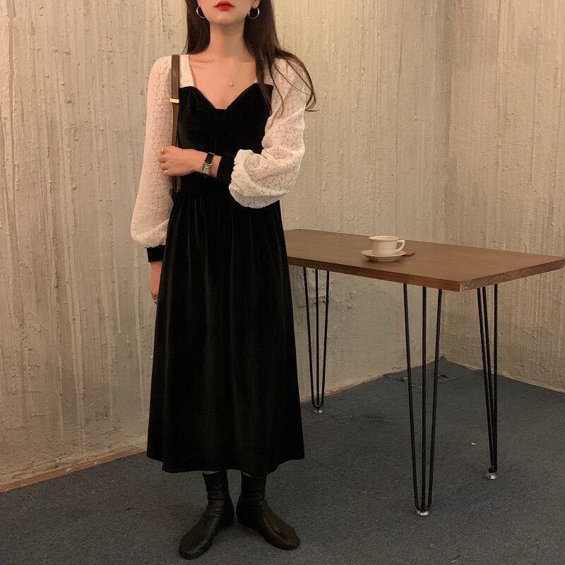 スタンダードカラーFlowerデザイン 長袖スリーブウェストベルベットドレス レディース ロング リボン レトロ フラワーデザイン スクウェア ステッチ ICC_レディース11227826749