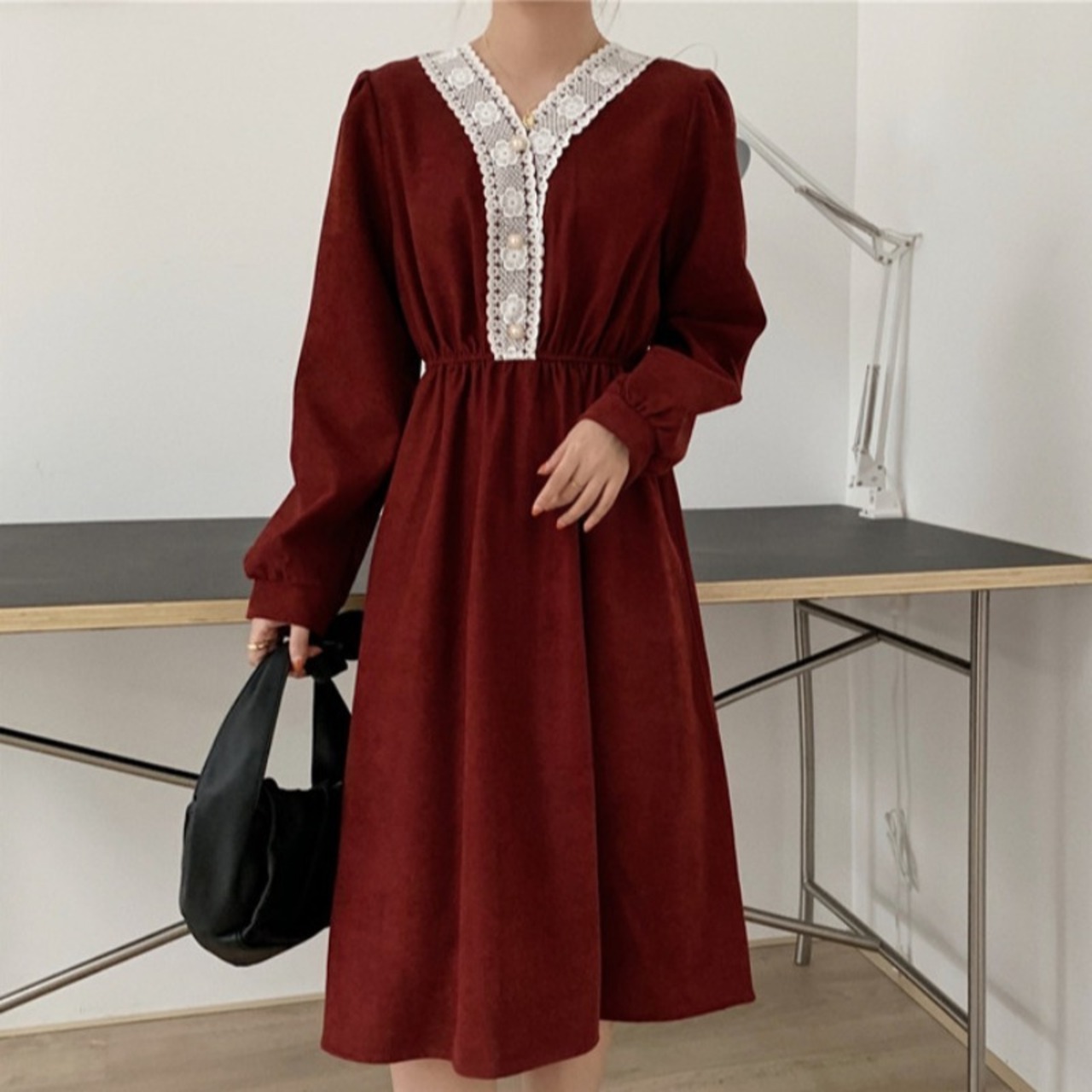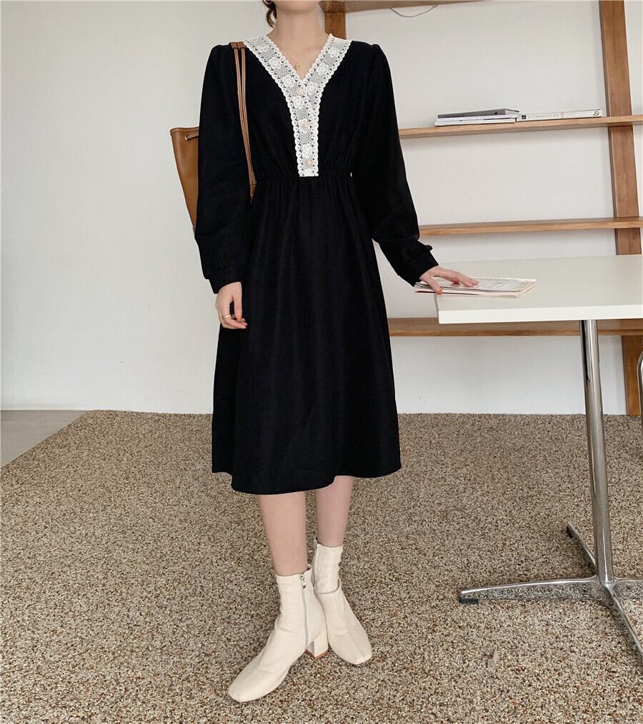 オータムウィンターゴールドベルベットレースドレス レディーススタンダードスタイルブラックコート ロングスカート レトロ 秋物 冬物 ICC_レディース21650240843
