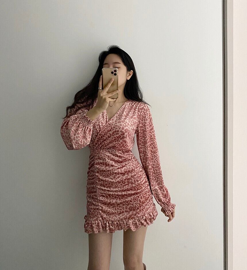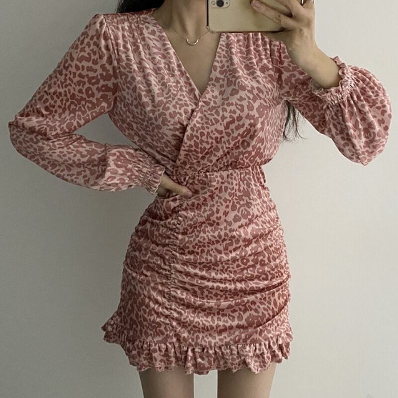 スタンダードVネックレオパードベルベットハイウェストウェストスカート ドレス ピンク レトロ ICC_レディース64745819464
