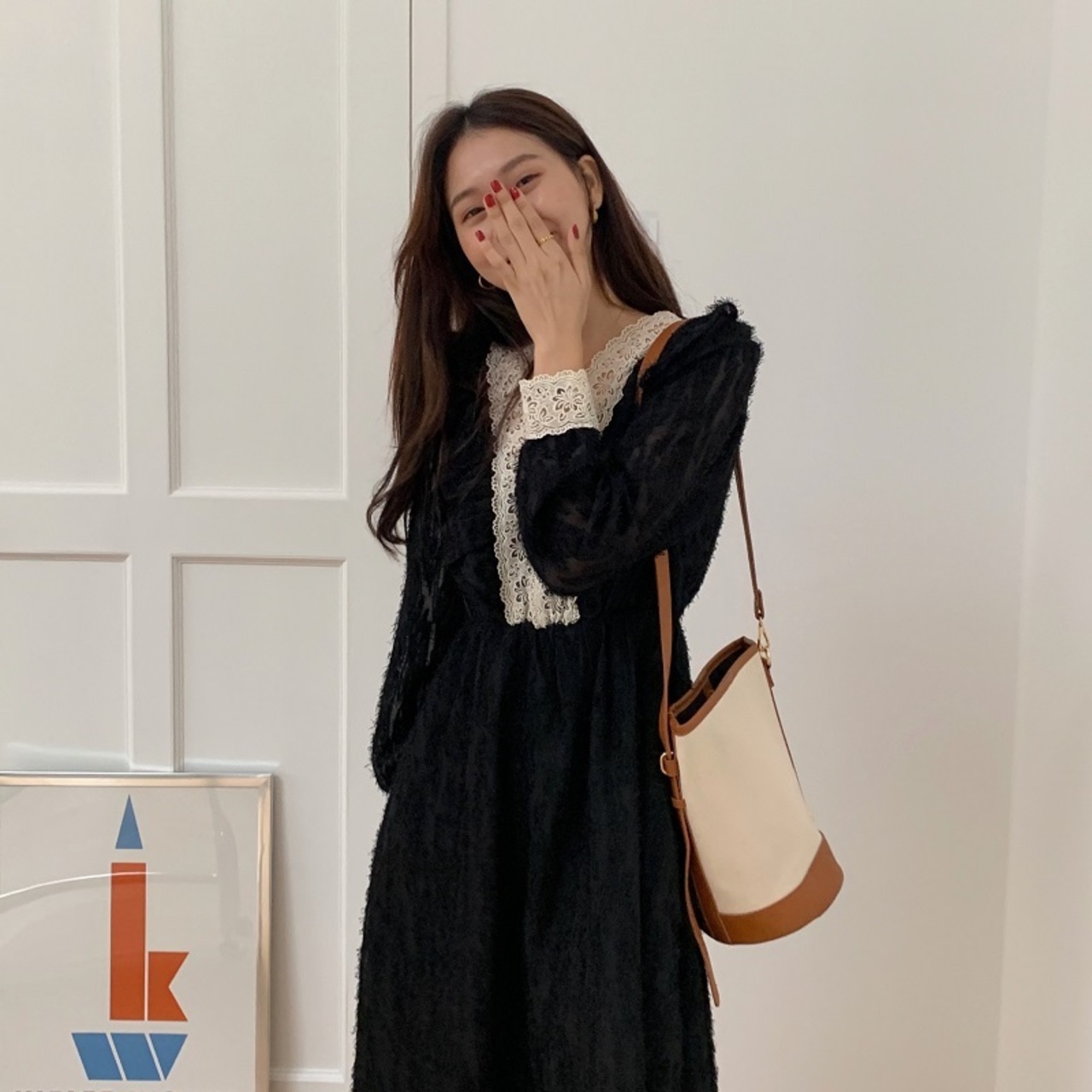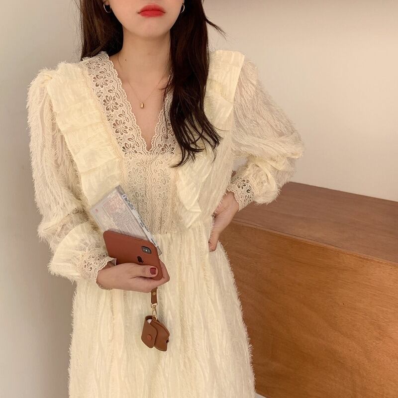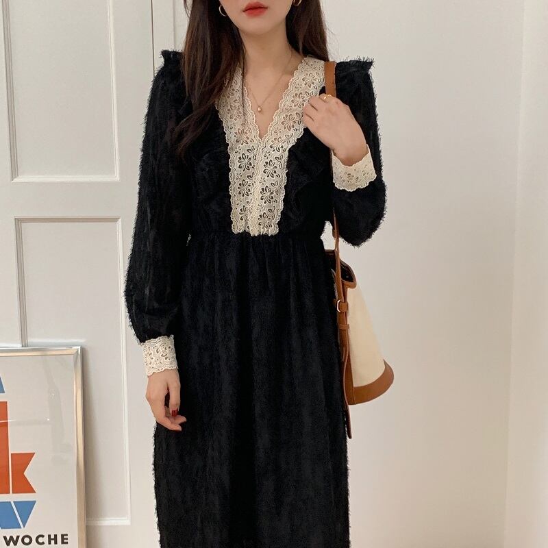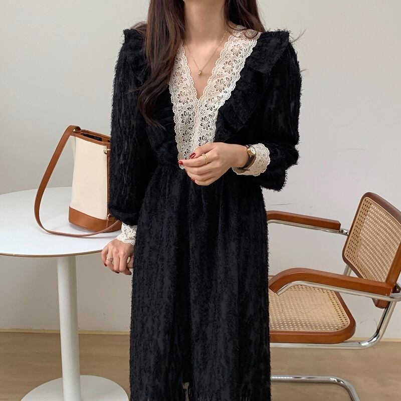 スタンダードカラーレースドレス Vネックハイウェストウェスト薄手スタイルロングスカート レトロ ICC_レディース50669190069