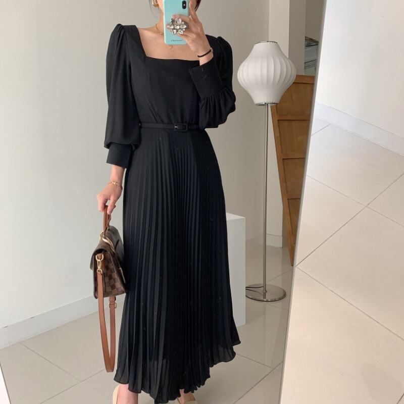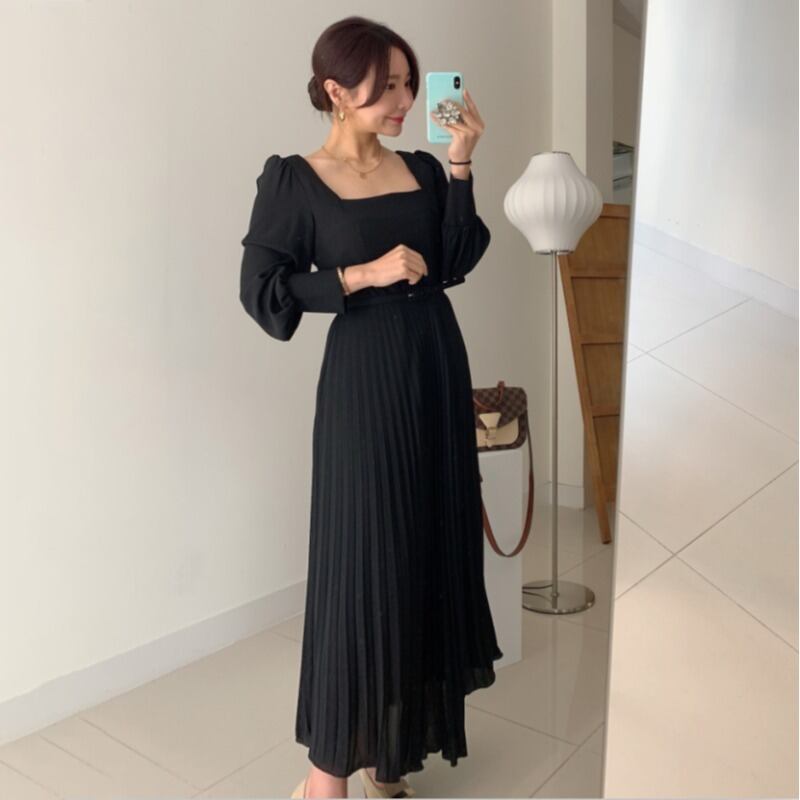 ロングオータムウィンターウェストプリーツドレス ランタンスリーブ エレガント 秋物 冬物 スカート スクウェア ICC_レディース54601807142