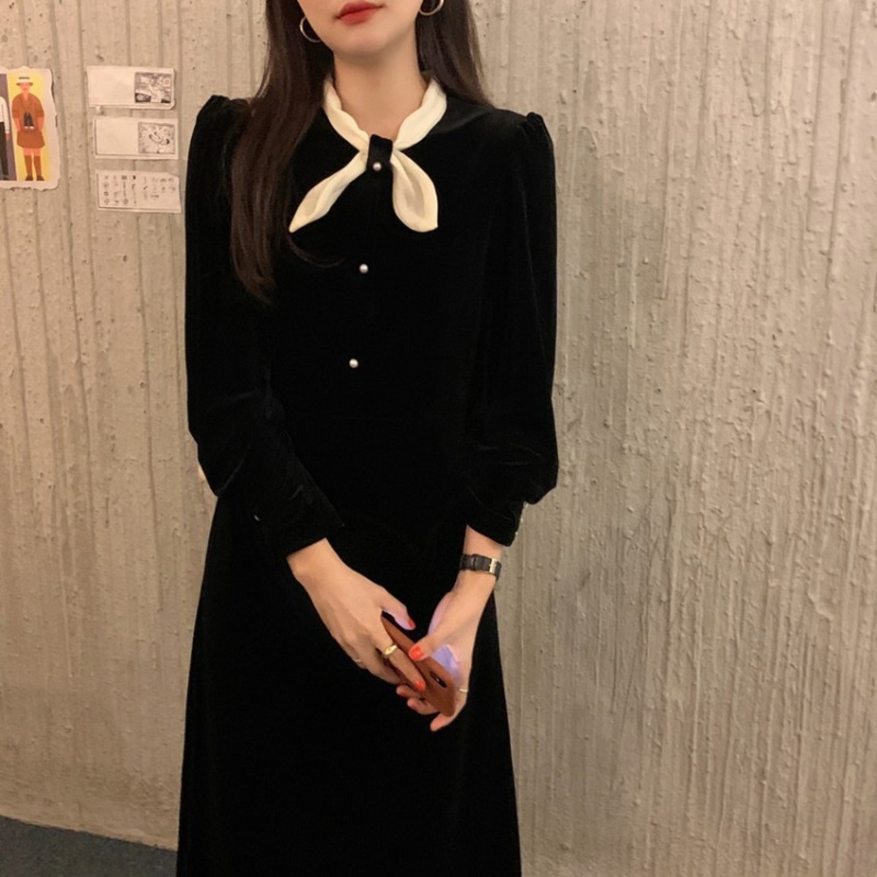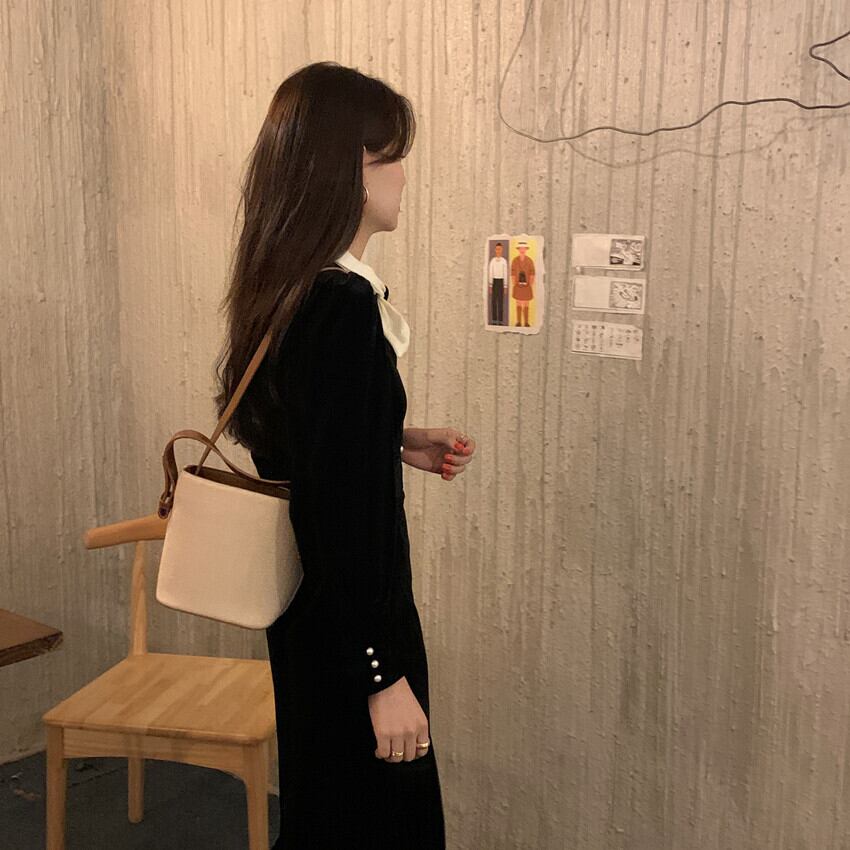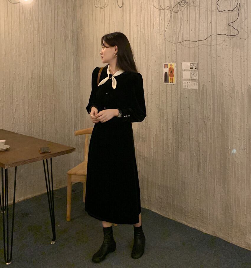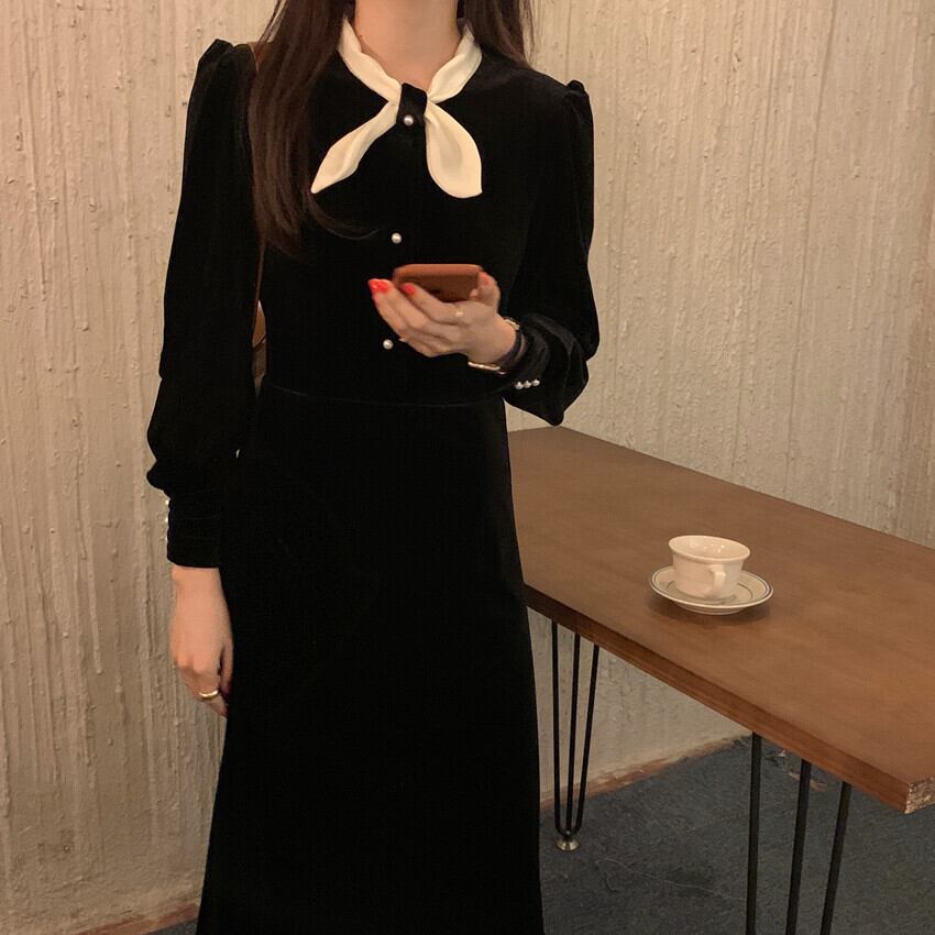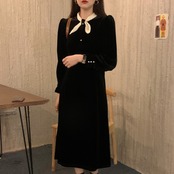 オータムウィンターラウンドネックスリーブスリムロングAラインブラックゴールドベルベットドレス リボン 秋物 冬物 Oネック ICC_レディース75849317226