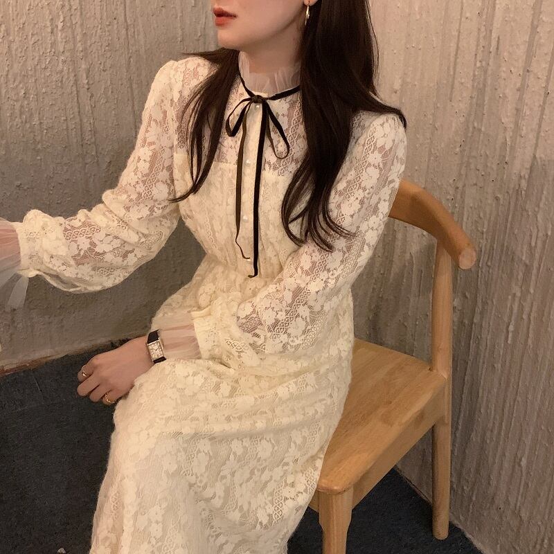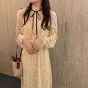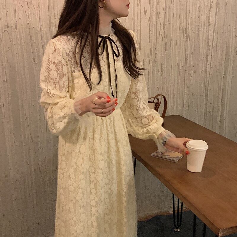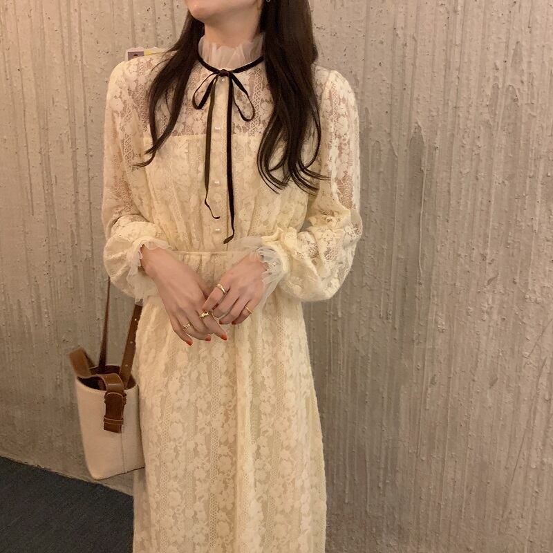 オータムウィンタースタンダードカラーレースドレス ロング レトロ 大人ガーリー スウィート キュート カジュアル 秋物 冬物 ICC_レディース17139102259