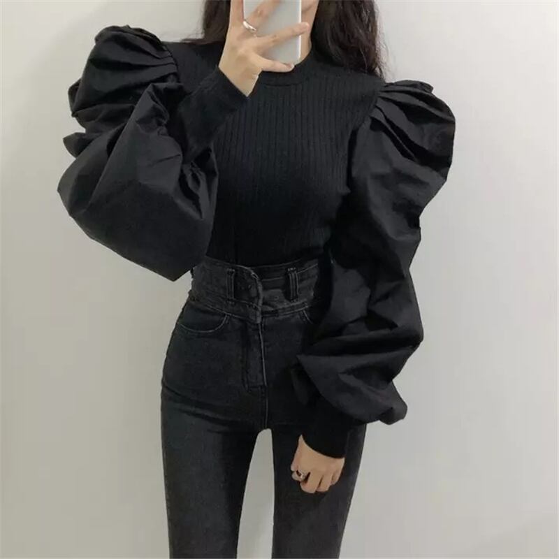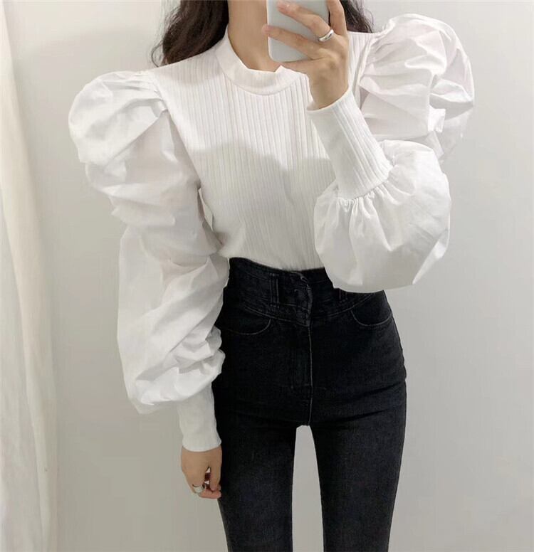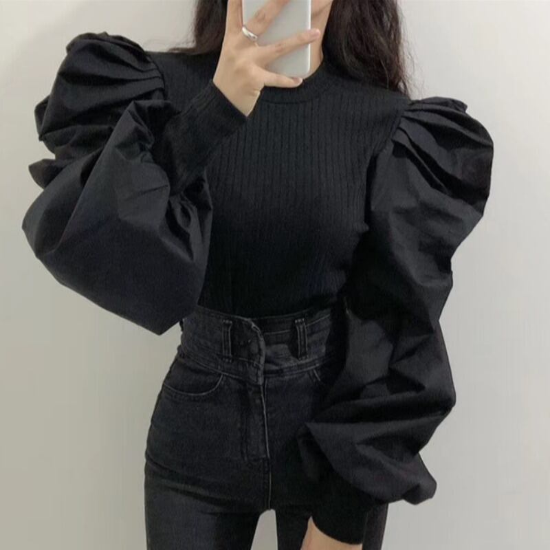 スタンダードスタイルラウンドネックスリーブセーター 薄手シャツ ランタンスリーブ レトロ レース Oネック ステッチ ICC_レディース81971121126