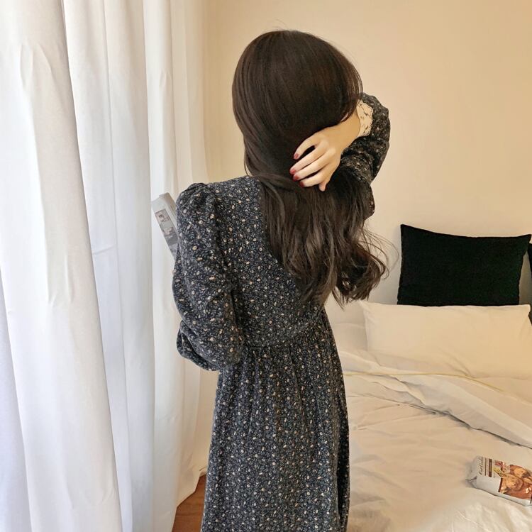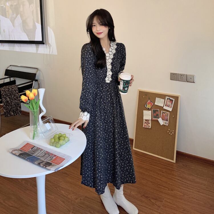 スタンダードレースVネックウェスト薄手フローラルドレス レトロ 花柄 ステッチ ICC_レディース88590368123