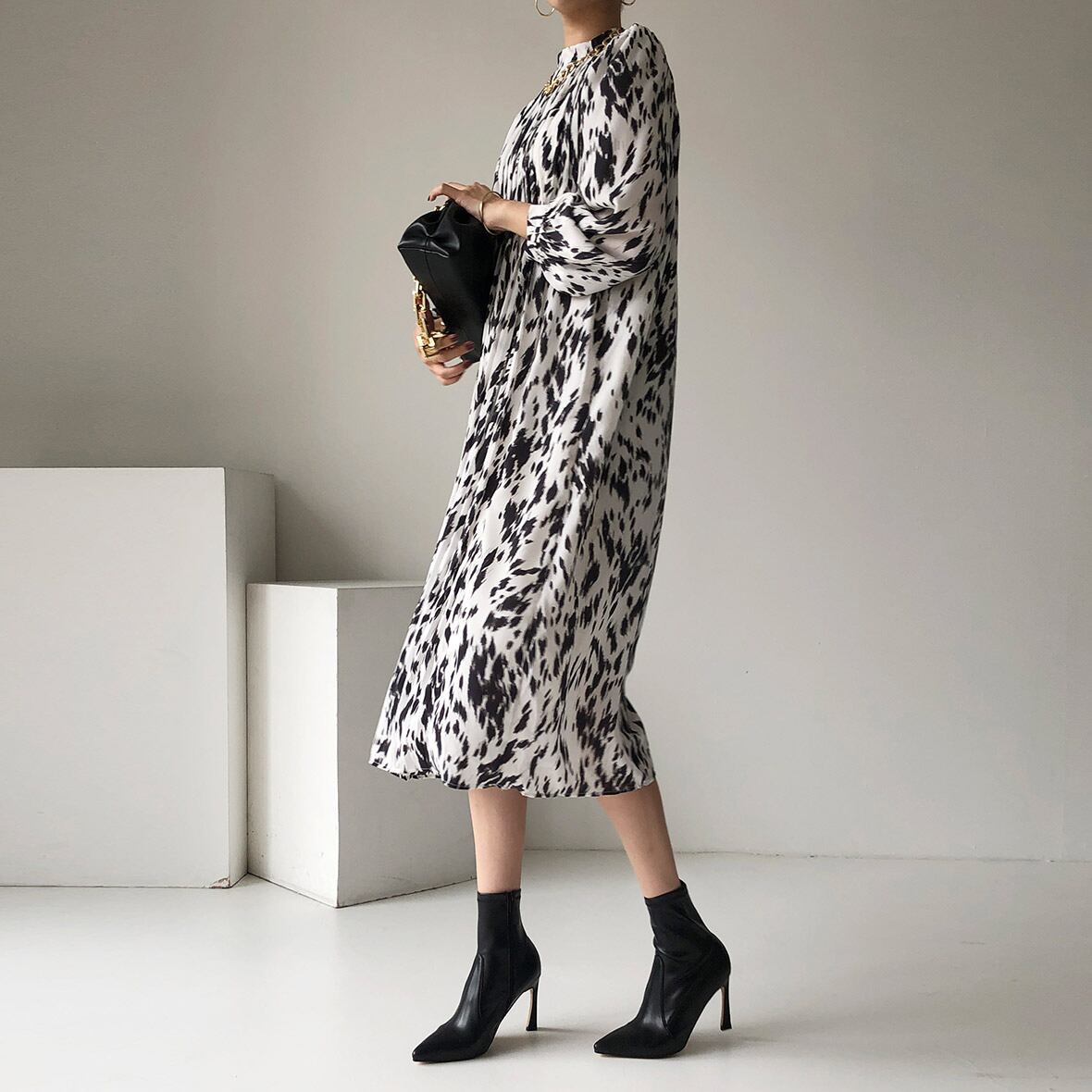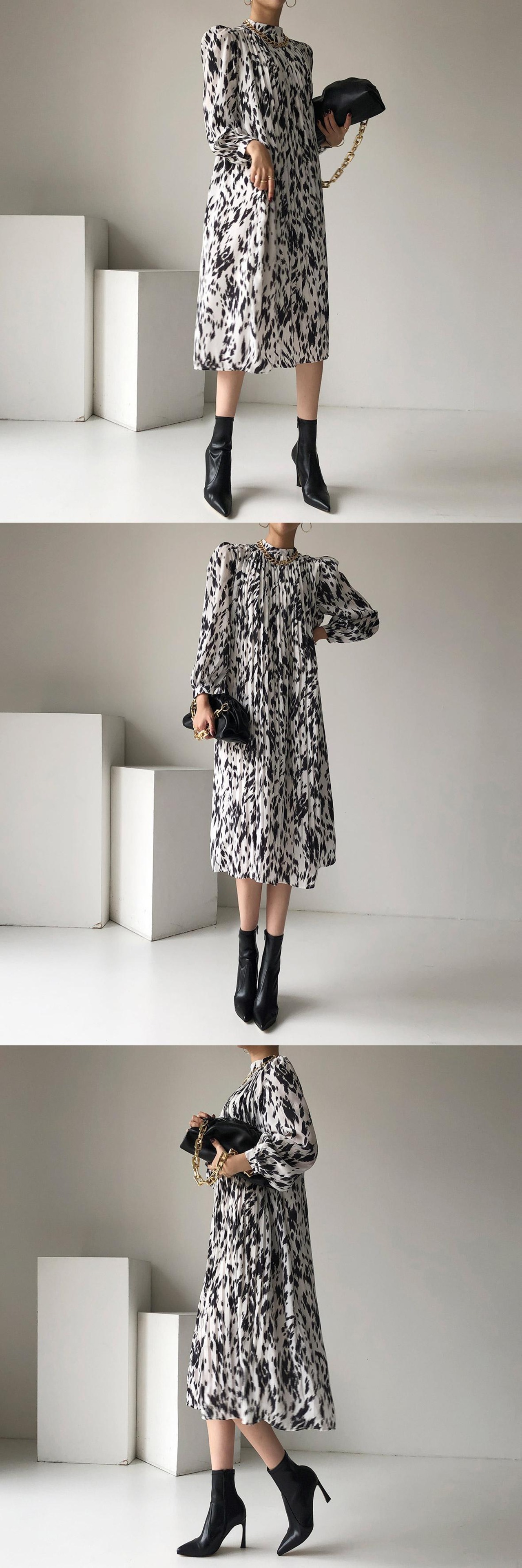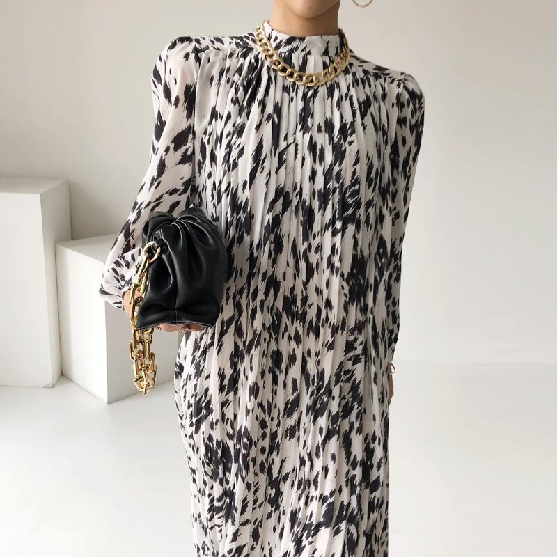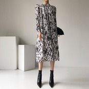 オータムウィンタースタンダードスタンドカラーカラープリーツウェストドレス レディース レトロ 秋物 冬物 ICC_レディース32778251356