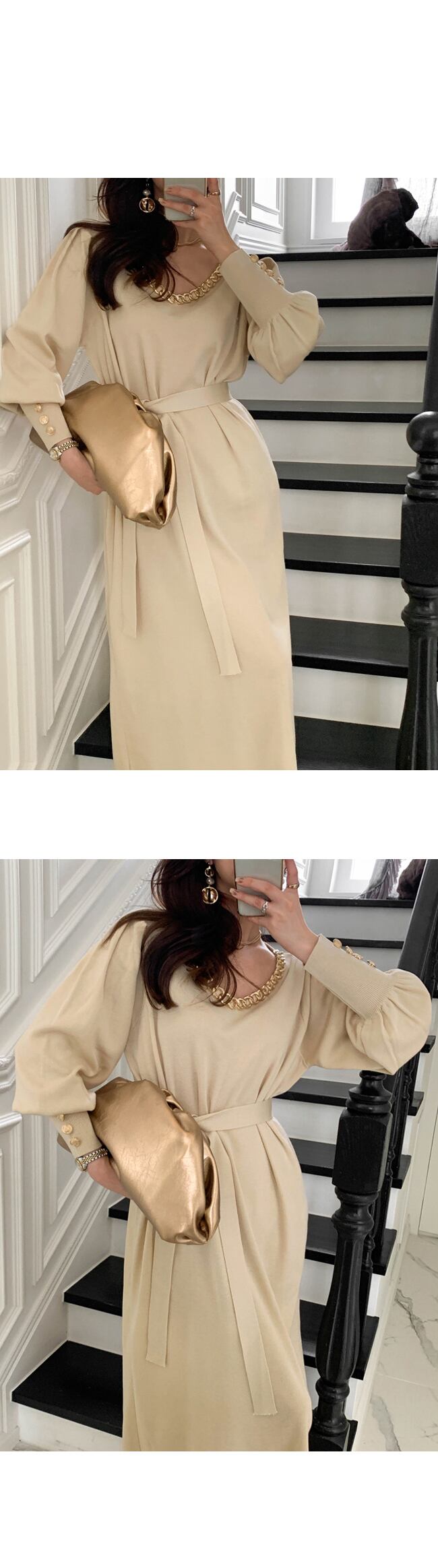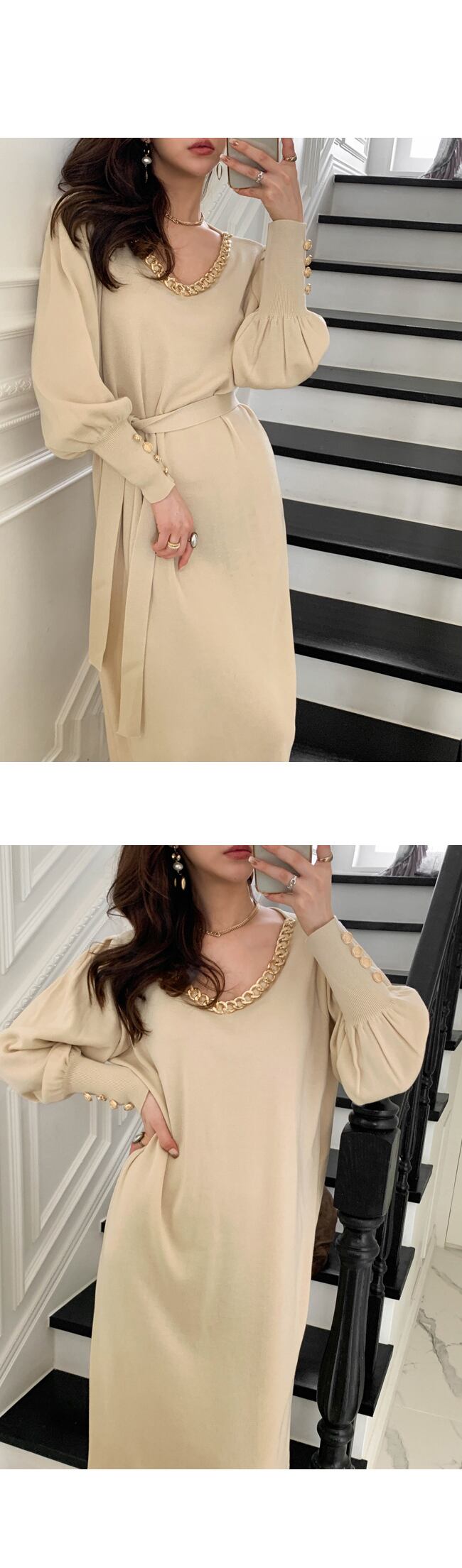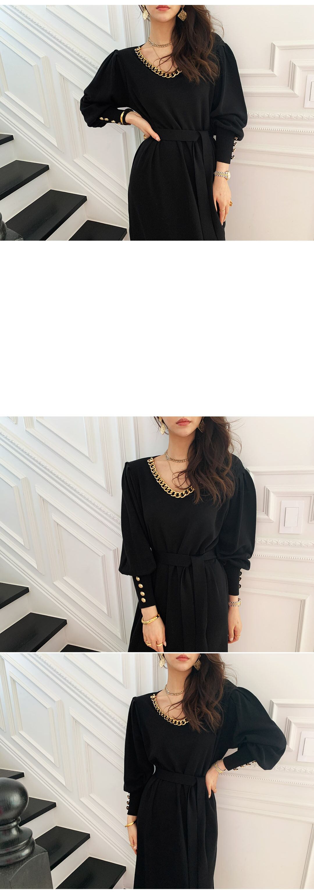 オータムウィンターVネックバックルルーズレースウェストスリーブニットドレス ランタンスリーブ エレガント 秋物 冬物 ステッチ ICC_レディース86779597537