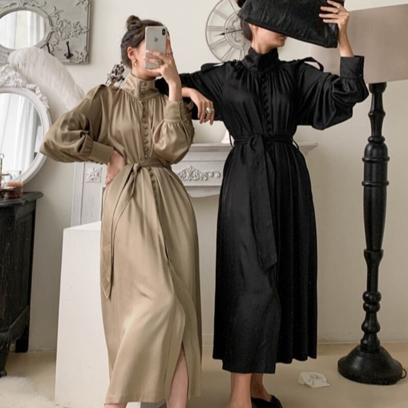 オータムウィンターウェストスリーブドレス ロングスカート ランタンスリーブ レース 秋物 冬物 レースアップ ICC_レディース69735193659