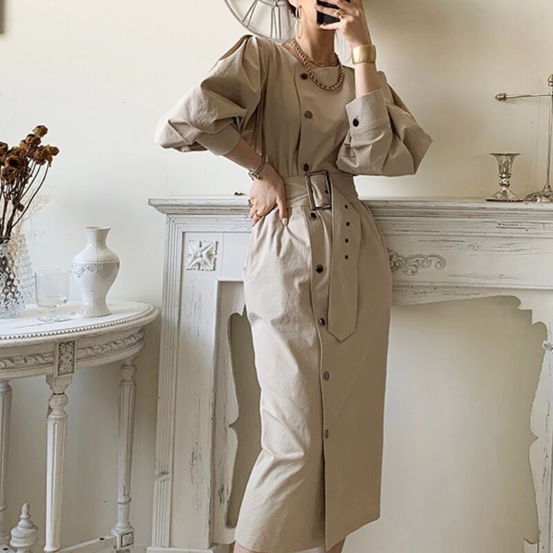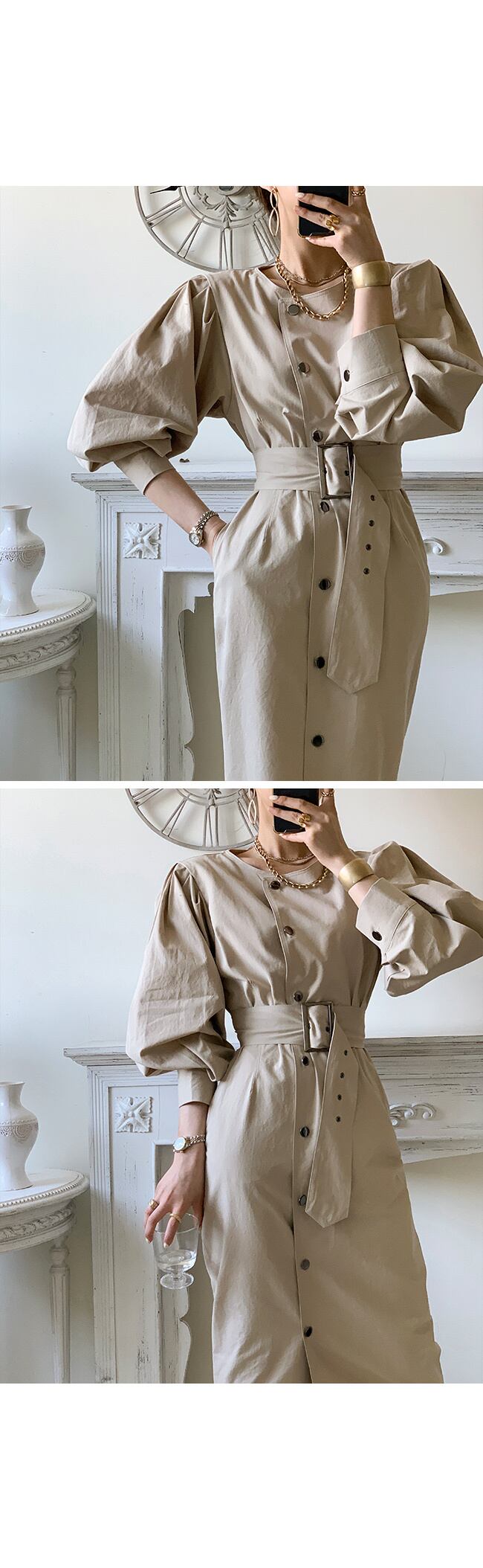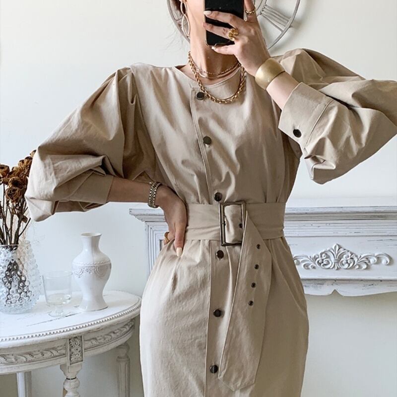 オータムウィンタースタンダードスタイル薄手ボタンドレス レディース ロング レトロ 秋物 冬物 ICC_レディース82231717419