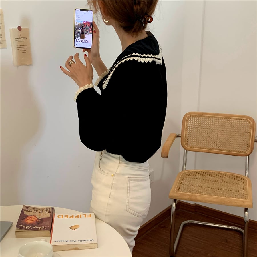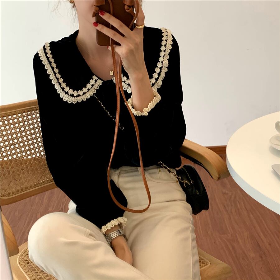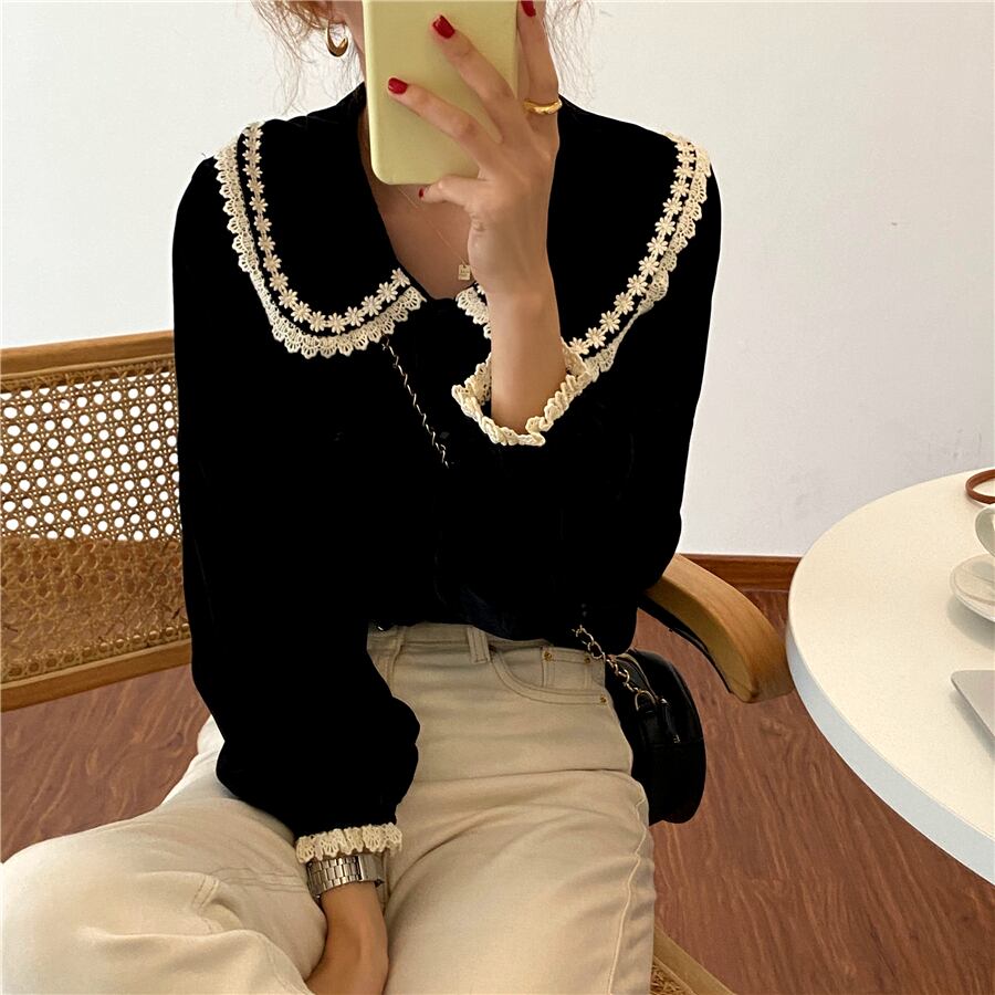シャツ スタイルスタンダードカラーレースブラックベルベットトップス レトロ ICC_レディース7954850384