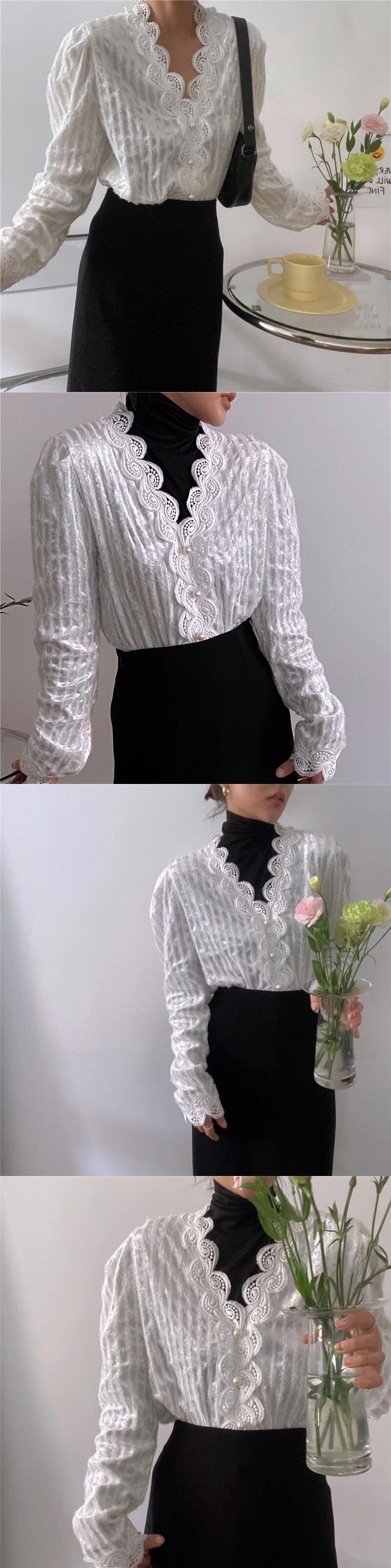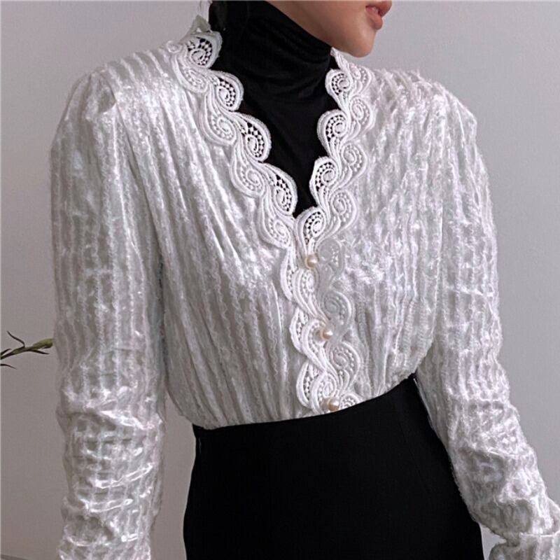 スタンダードVネックベルベットレースカラーシャツ ホワイト ロング レトロ エレガント ICC_レディース29453300987