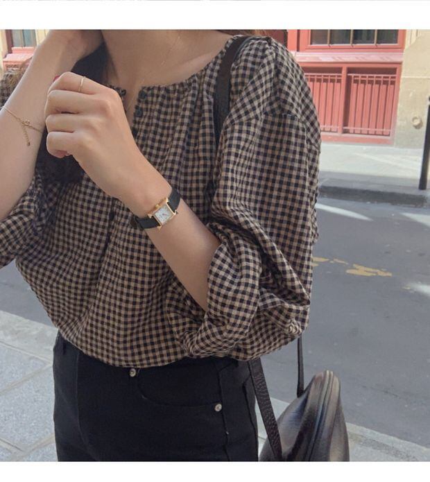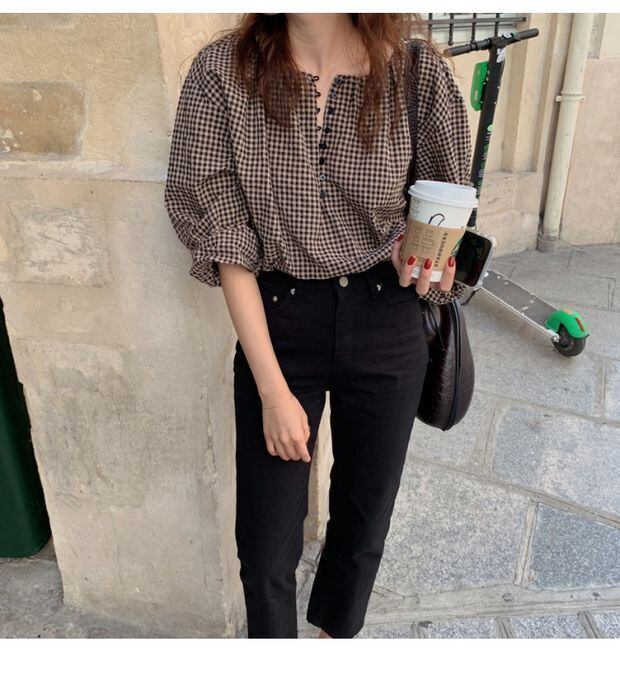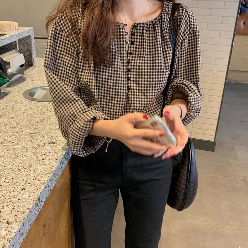 スプリングスタンダードスタイルルーズブラウス シャツ 格子柄 ロング レトロ 春物 左左右右88836227936