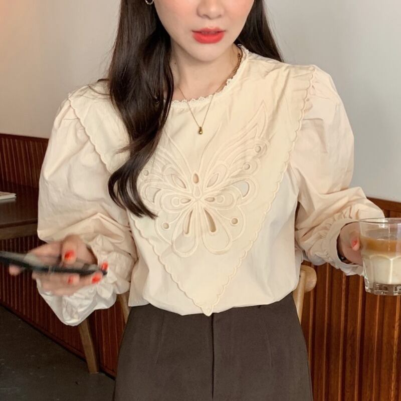 スプリング刺繍トライアングルラウンドネックレーススリーブシャツ 春物 Oネック ICC_レディース61522642409