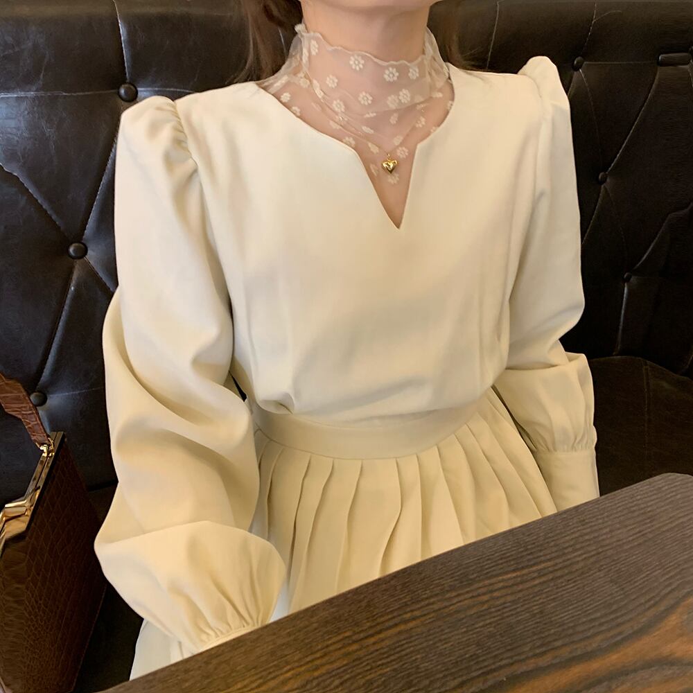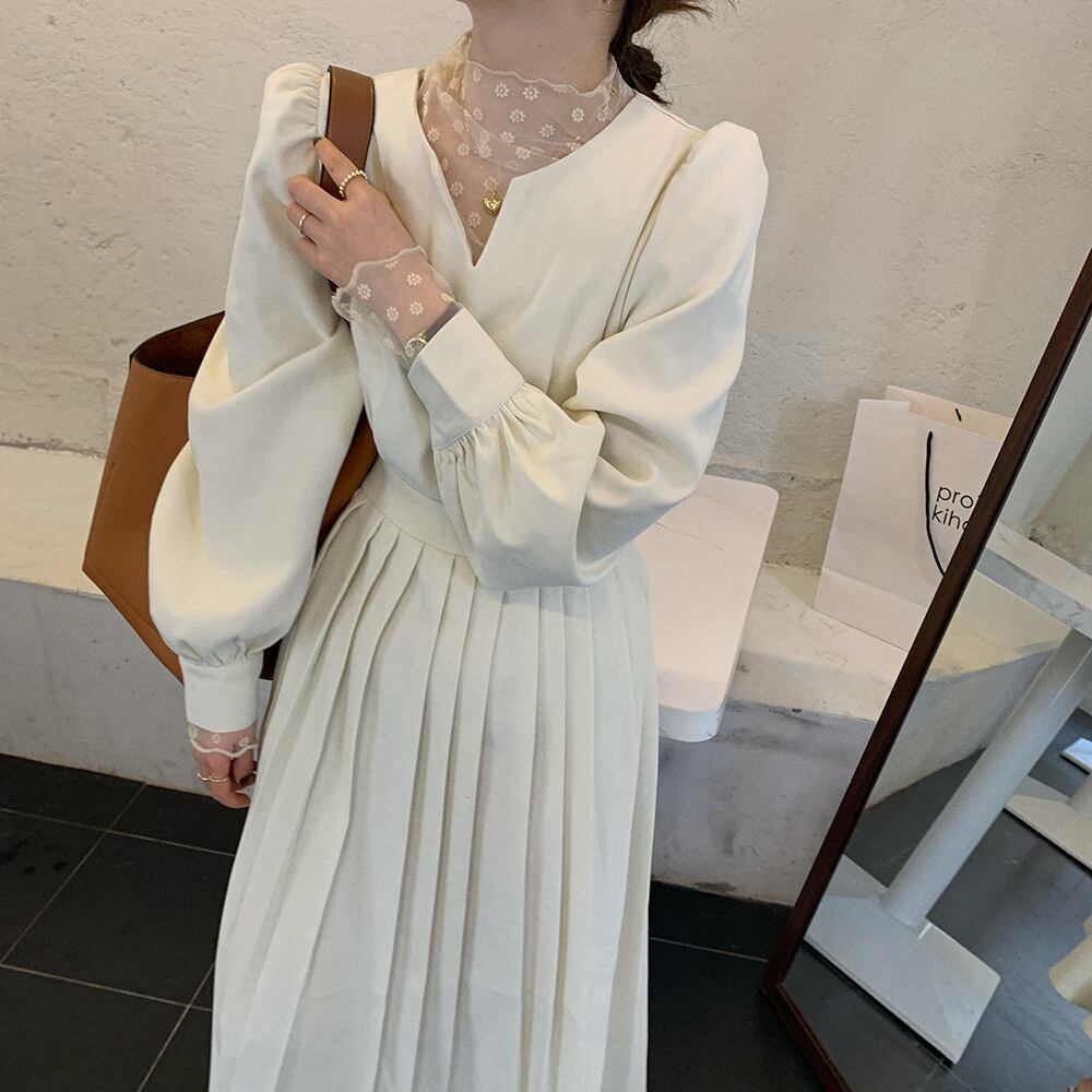 スタンダードカラーVネックプリーツウェストドレス セット レトロ ピュア フラワーデザイン ICC_レディース93602606432