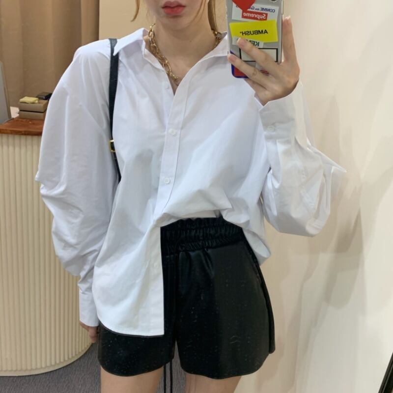 オータムスタイルスリーブルーズシャツ ハイウェストウェストレザーショーツ 秋物 ブルマー ICC_レディース85793429835