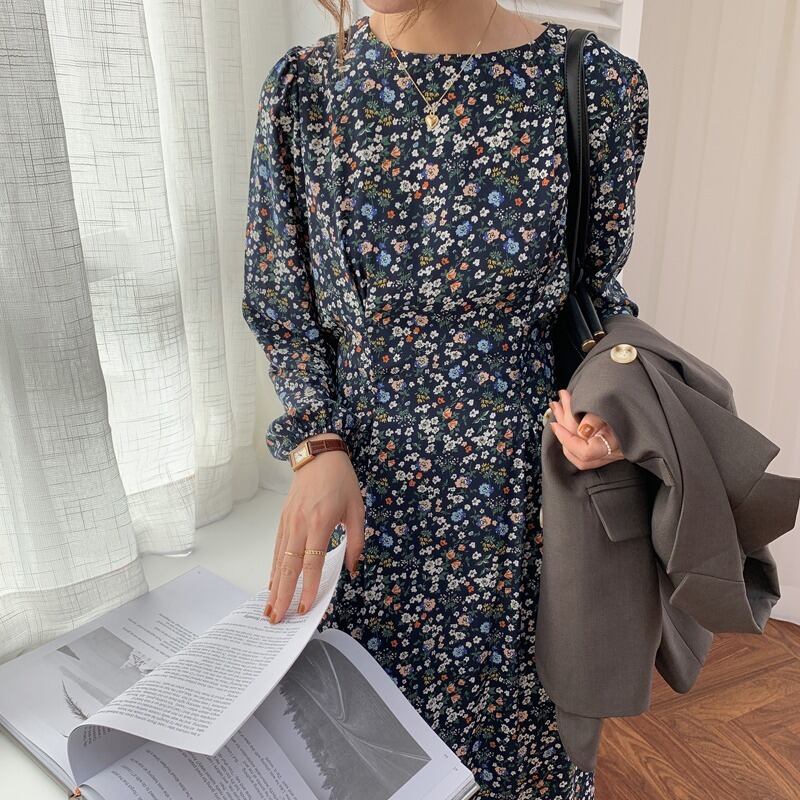 スタンダードフローラルラウンドネックウェスト薄手スカート ドレス レトロ エレガント 花柄 Oネック ICC_レディース77021765418