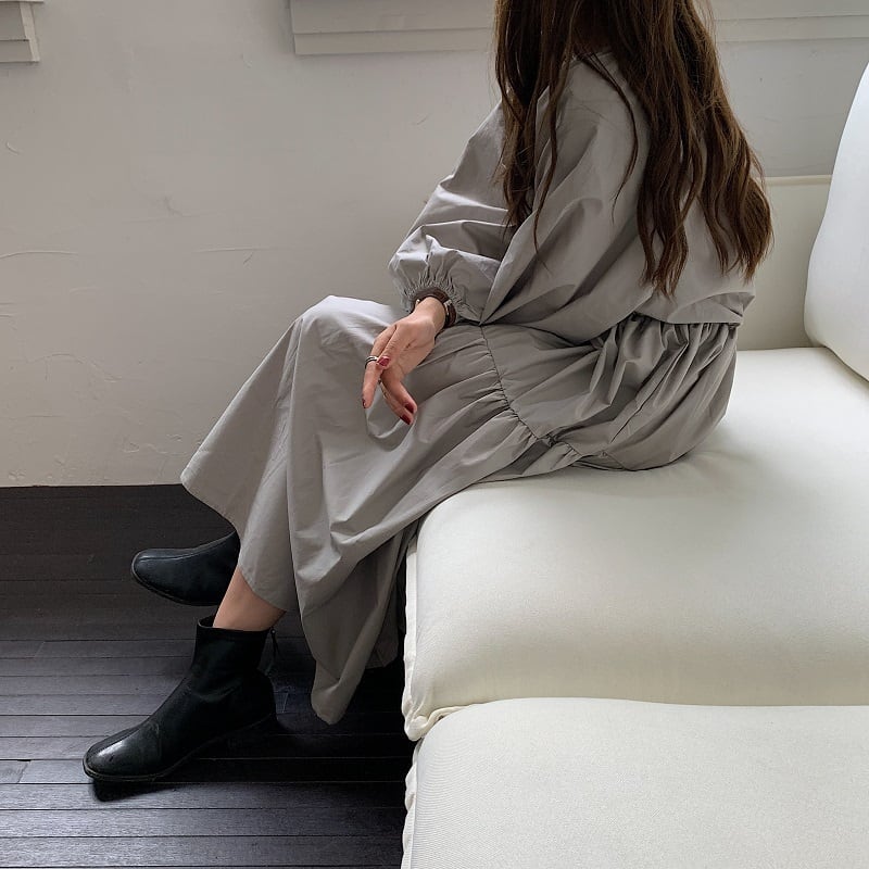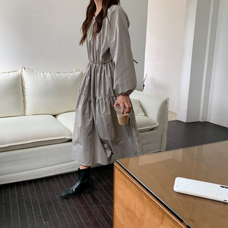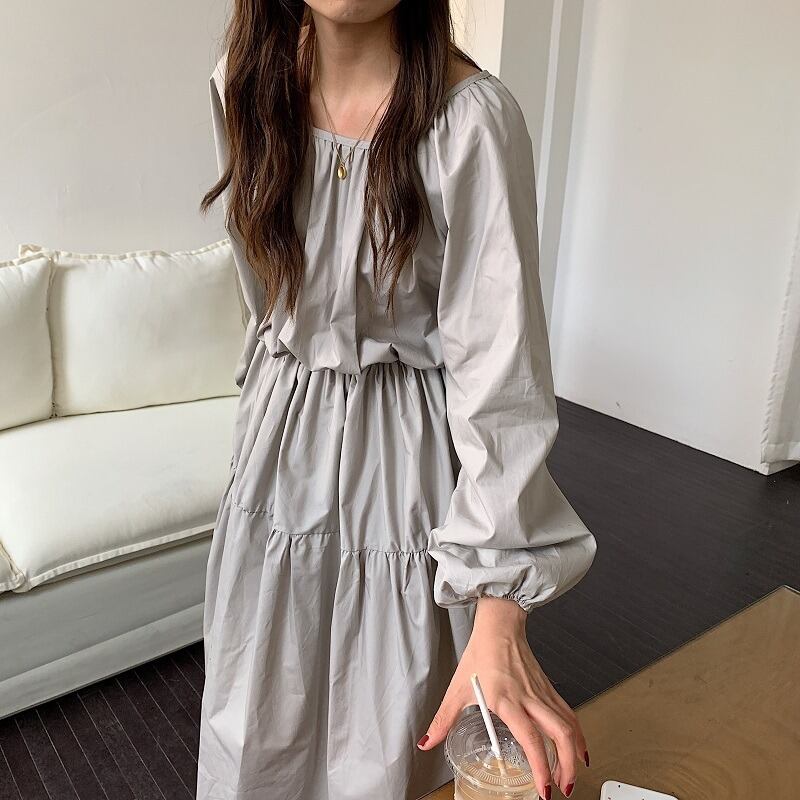 プリーツスリーブウェストドレス レディーススプリングオータムスタンダードスタイルスカート ランタンスリーブ レトロ 春物 秋物 ICC_レディース61751963969