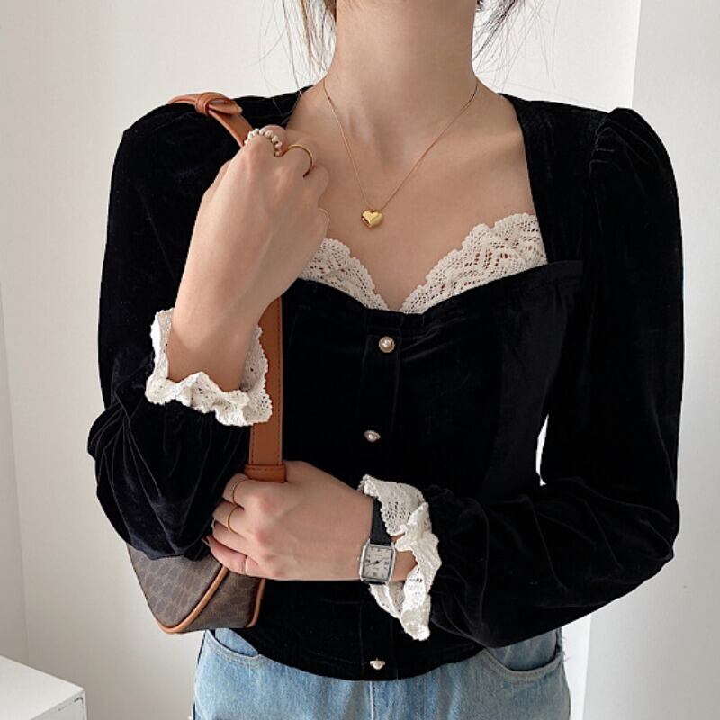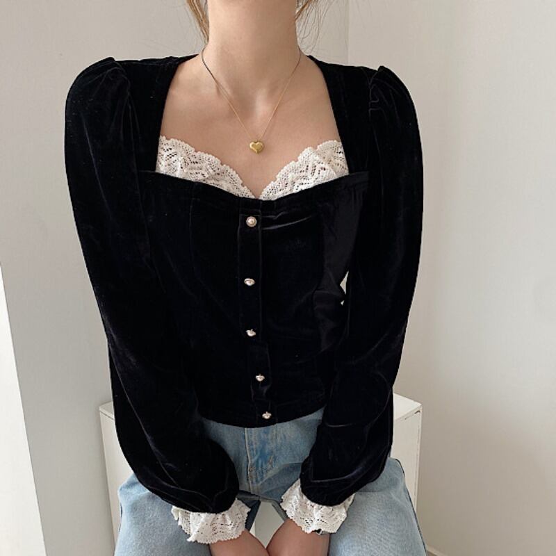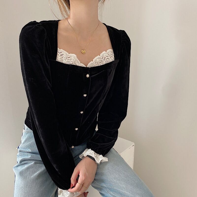 オータムスタイルベルベットシャツ レースレディース ロング 秋物 スクウェア ICC_レディース93431443444