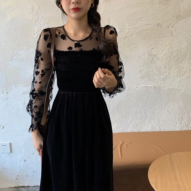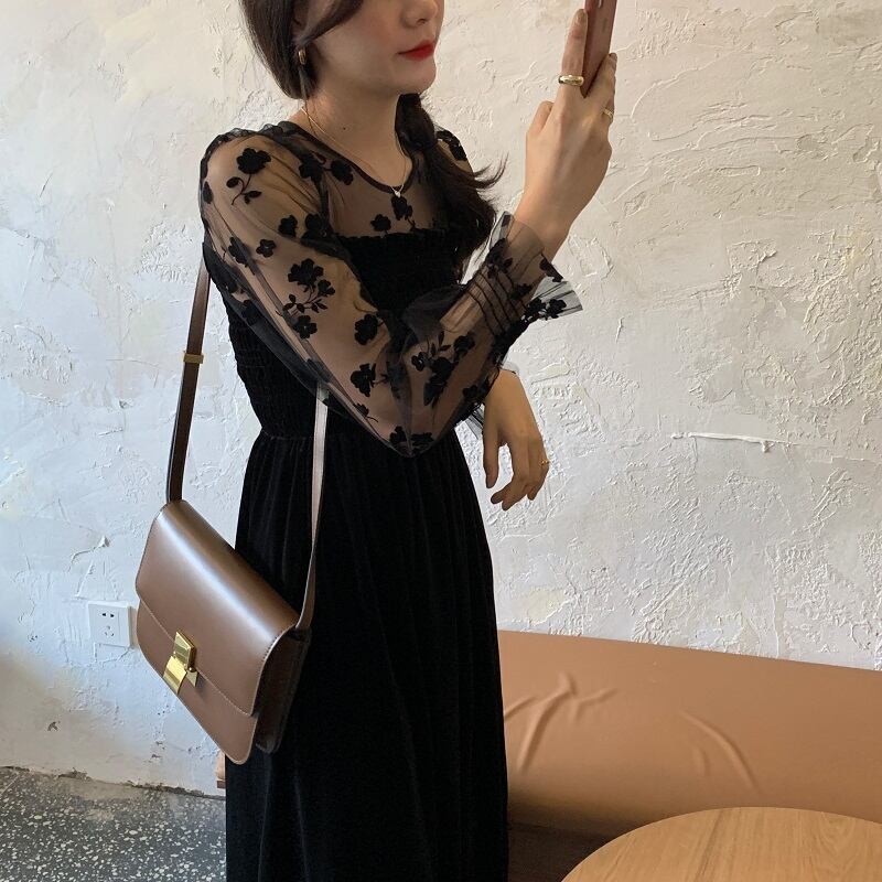 オータムスタイルメッシュスリーブベルベットスカート ストレッチウェストドレス ランタンスリーブ エラスティック 伸縮 秋物 ステッチ ICC_レディース75164149738