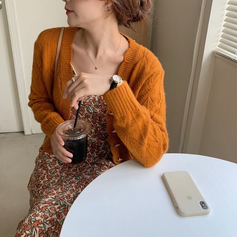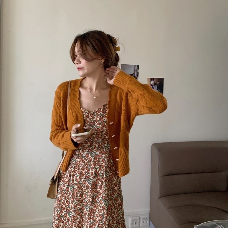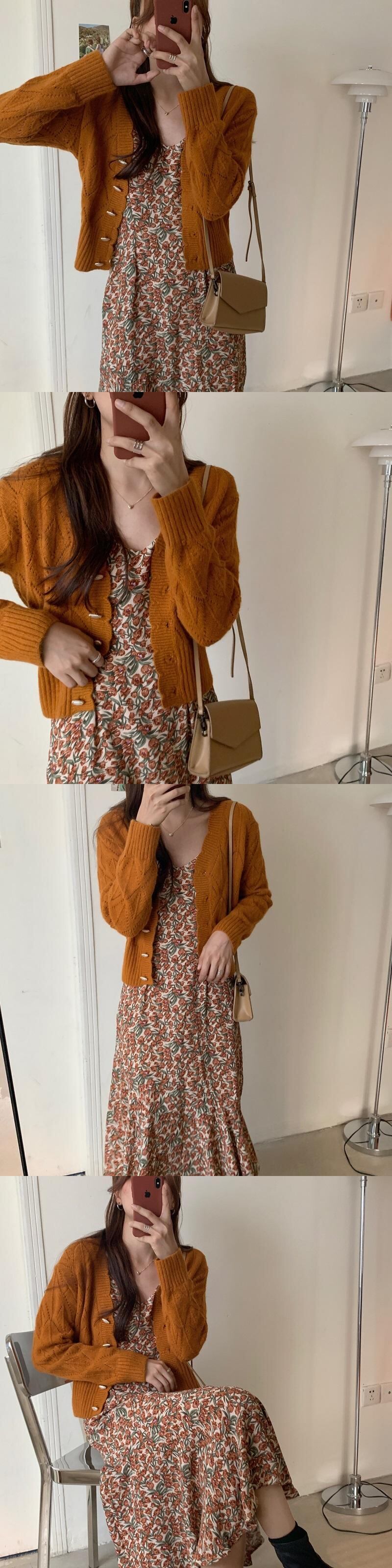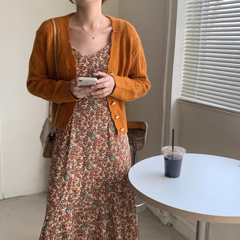 オータムVネックフローラルドレス パールバックルニットセーター 秋物 花柄 真珠 ICC_レディース46678426359