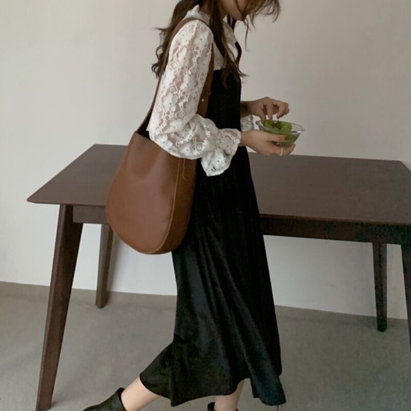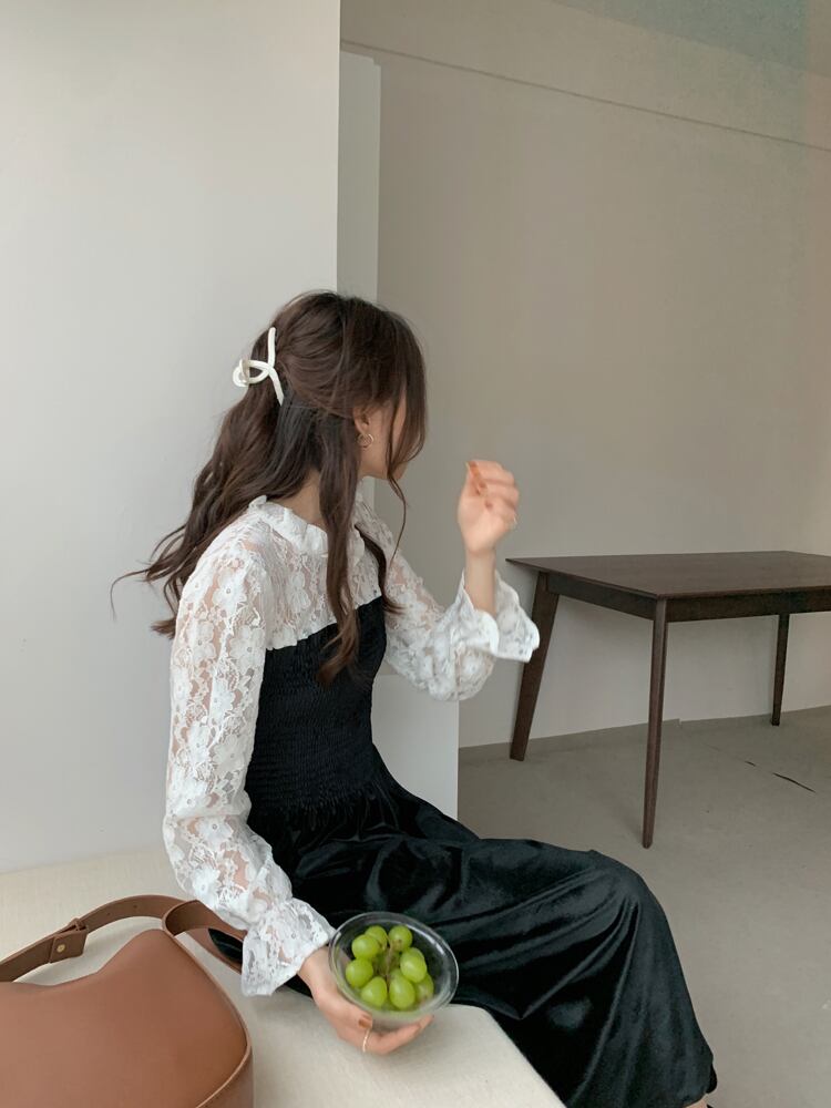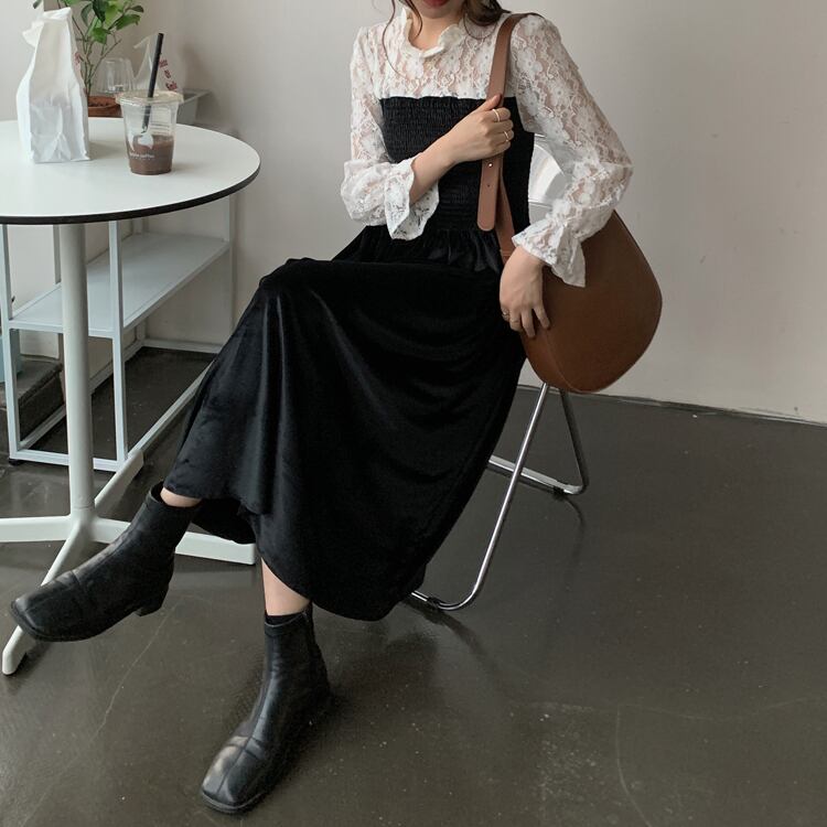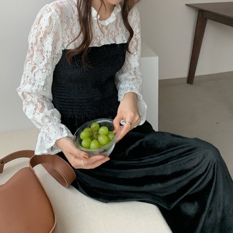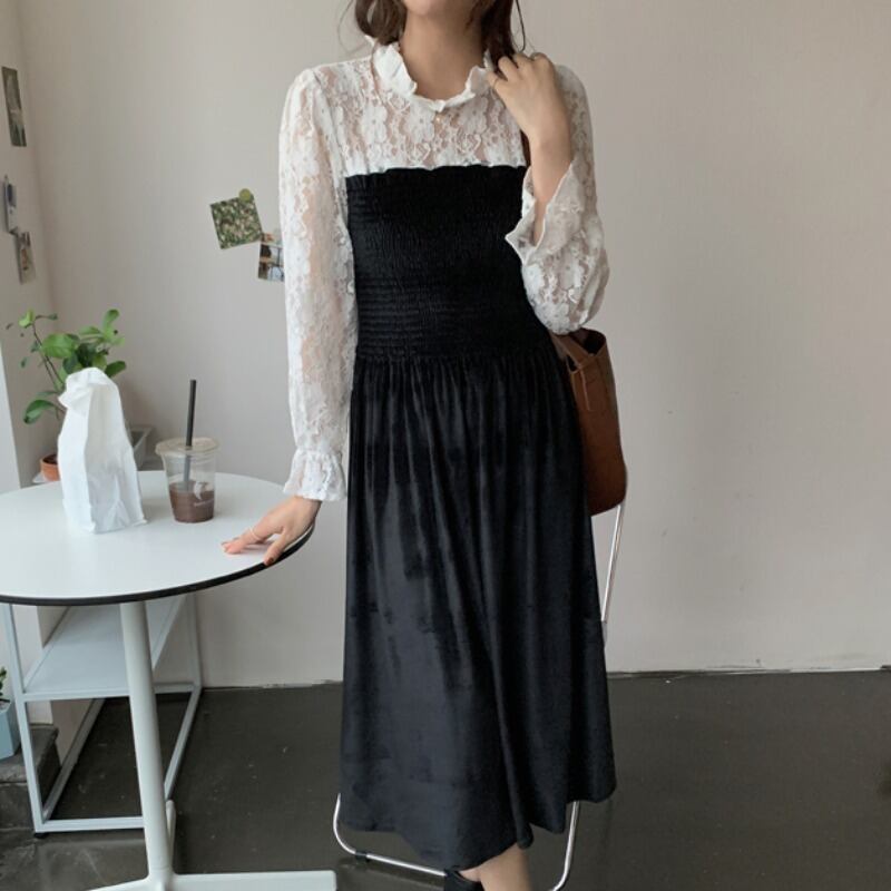 カラープリーツレーススリーブウェストベルベットドレス ロングスカート レッド エレガント ステッチ ICC_レディース66922389353