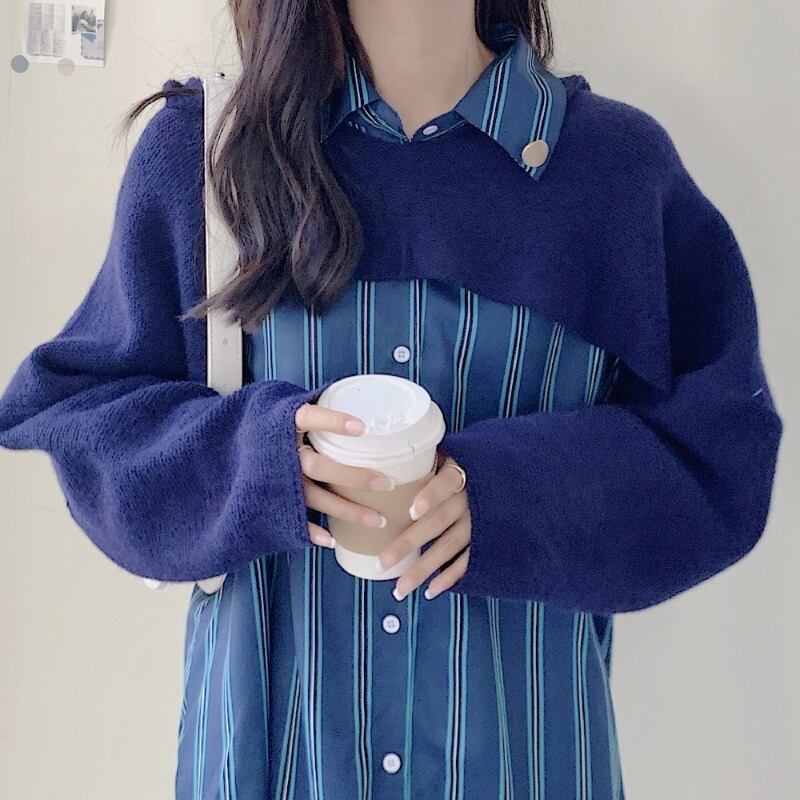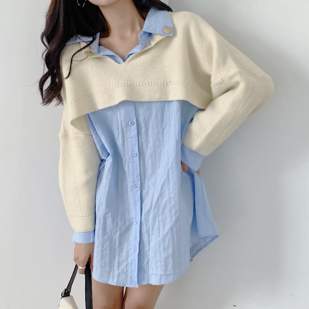 色:ライトブルーのシャツ,ダークブルーのシャツ,ベージュのニットブラウス,ダークブルーのニットブラウス