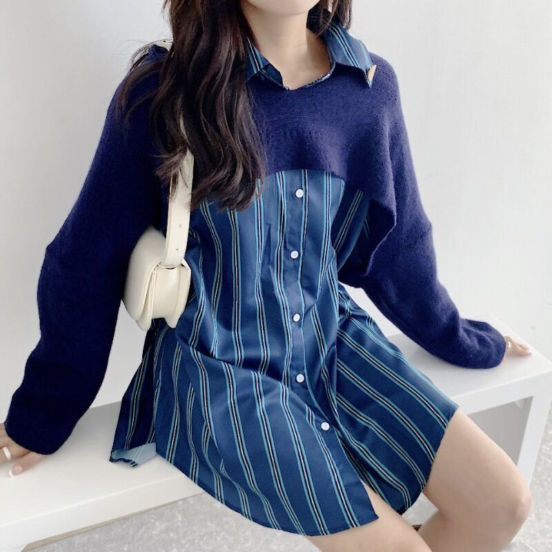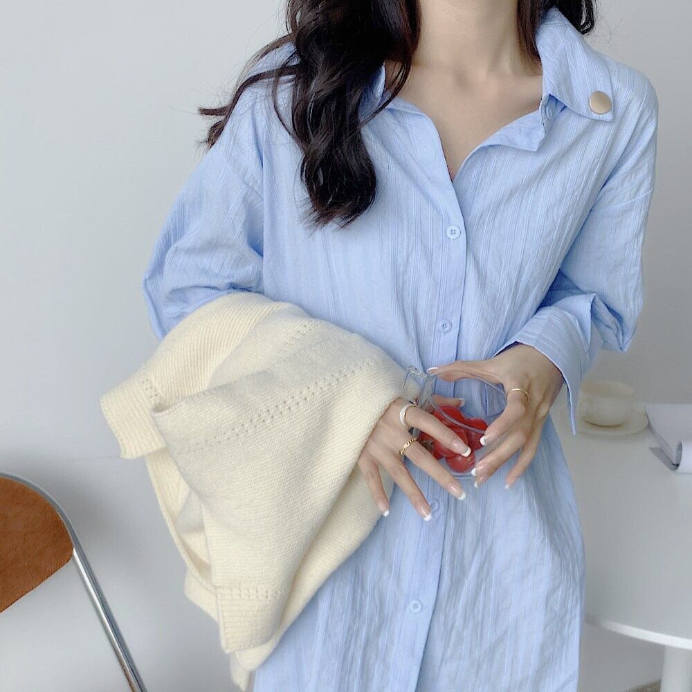 オータムストライプシャツ スタンダードブラウス ロング レトロ 秋物 ICC_レディース9925387367
