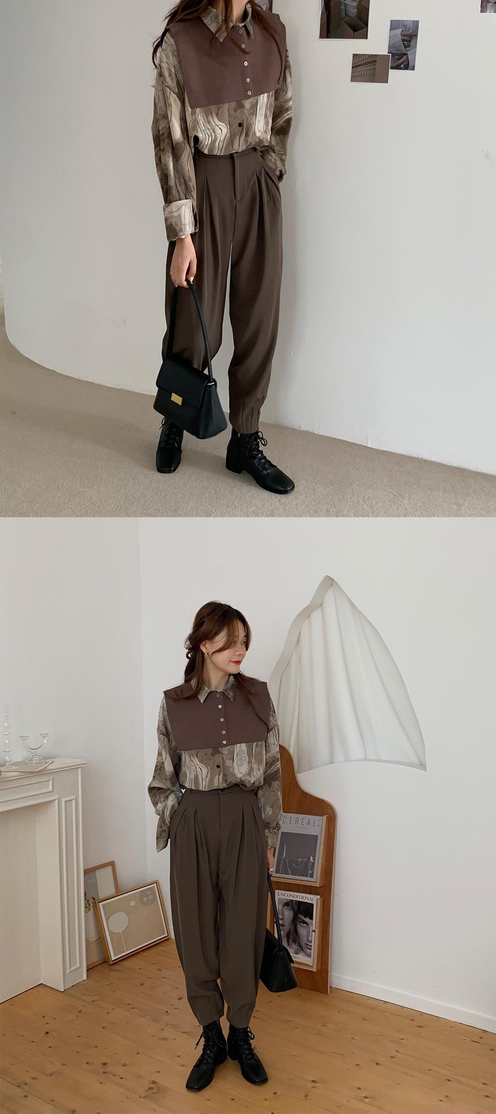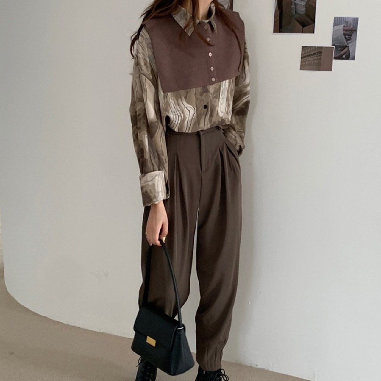 色:ショール付きグレーシャツ,ショール付きカードカラーシャツ,黒いズボン,コーヒーカラーパンツ