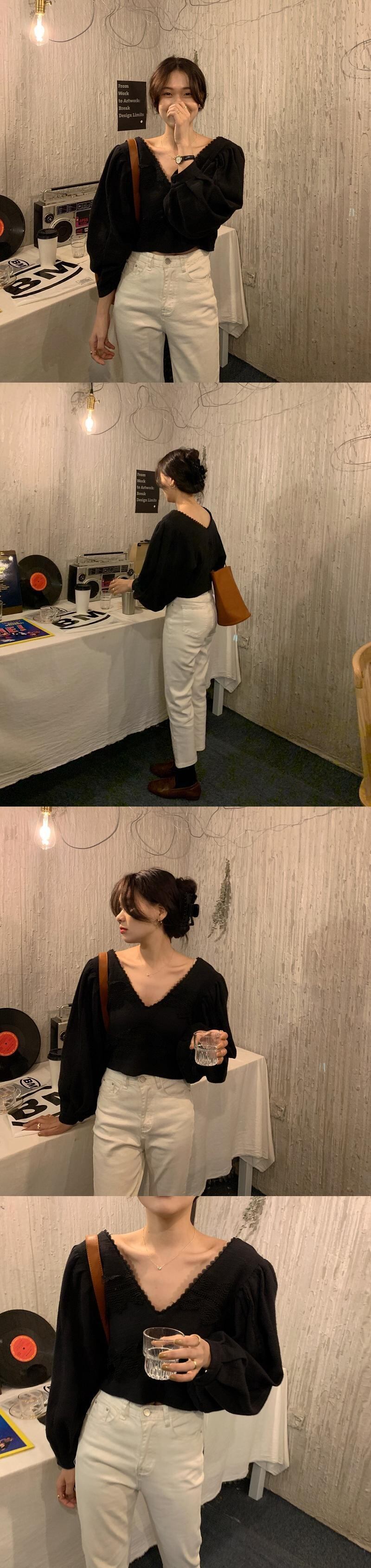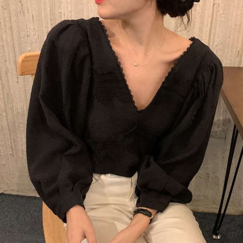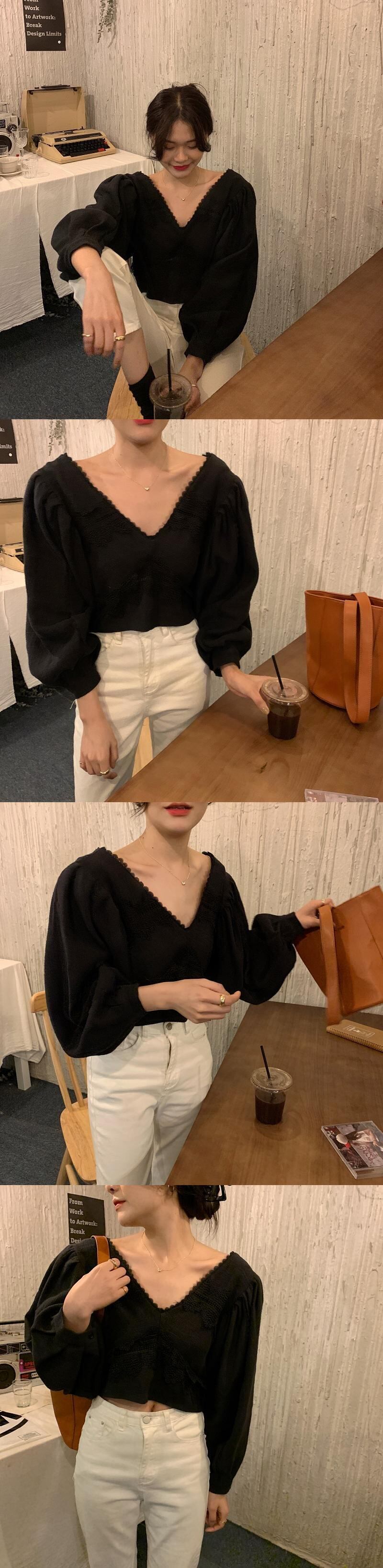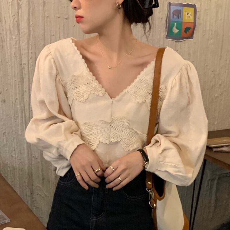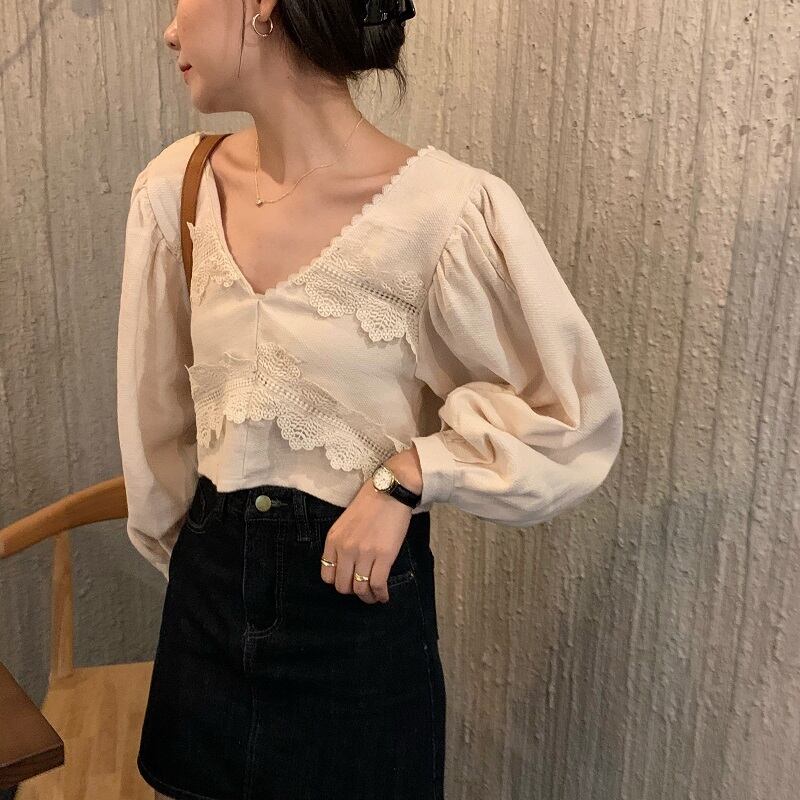 オータムスタイルVネックレーススリーブショートシャツ ランタンスリーブ 秋物 ステッチ ICC_レディース69945073641