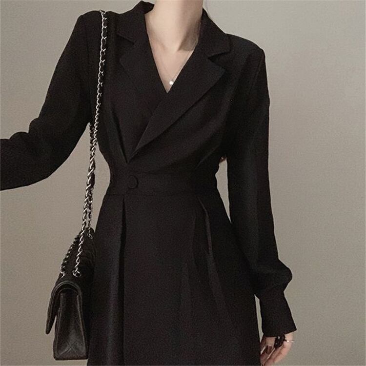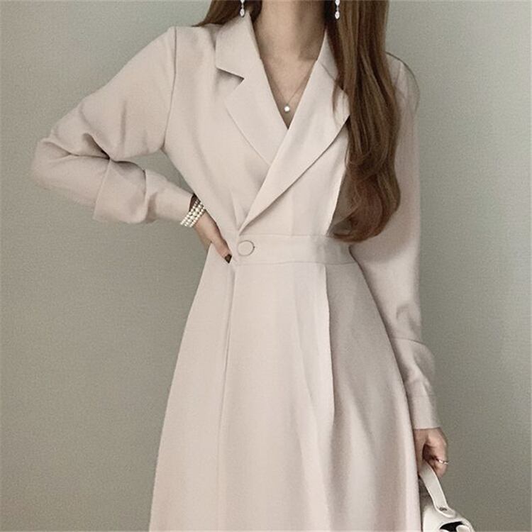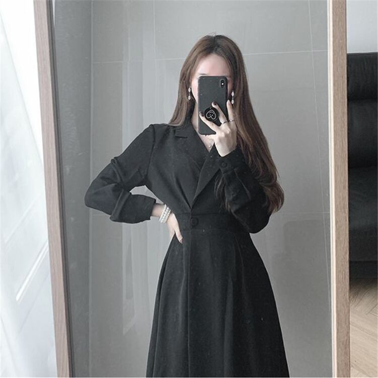 オータムスタイルハイウェストウェストカラースカート 薄手長袖スリーブソリッド ドレス レディース ロング 秋物 ソリッドカラー ICC_レディース80795548270