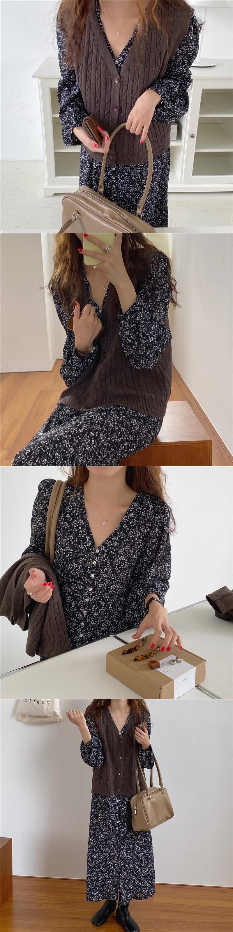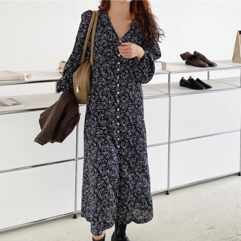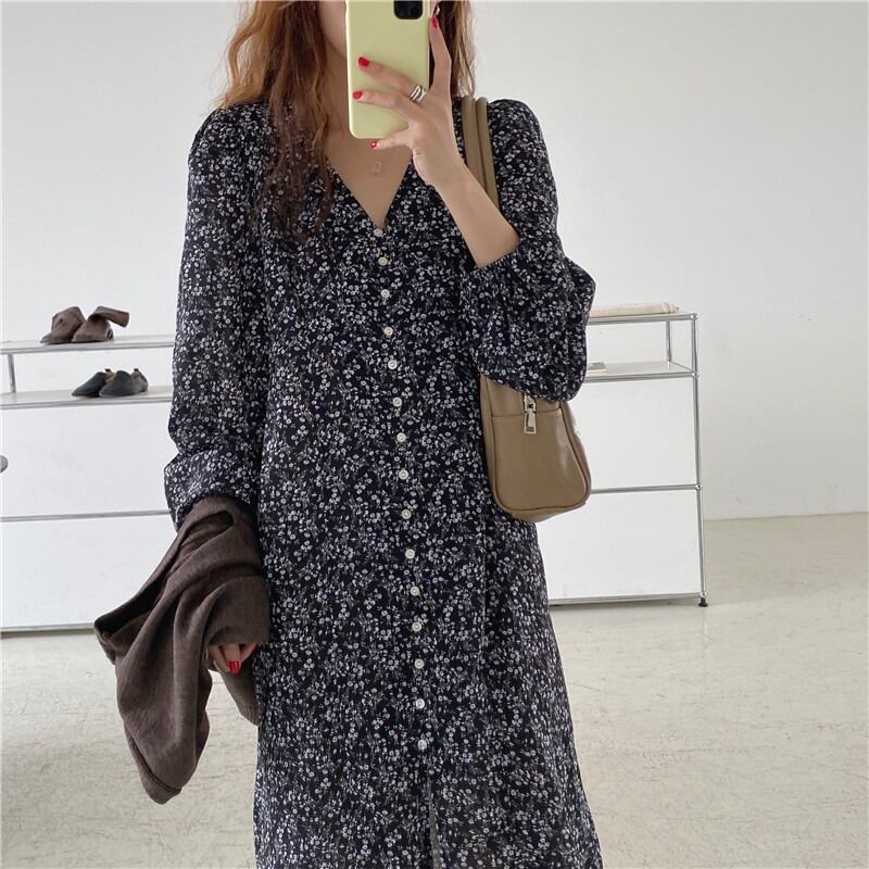 スタンダードオータムウェストVネックフローラルシフォンドレス レトロ 秋物 花柄 ICC_レディース60889599396