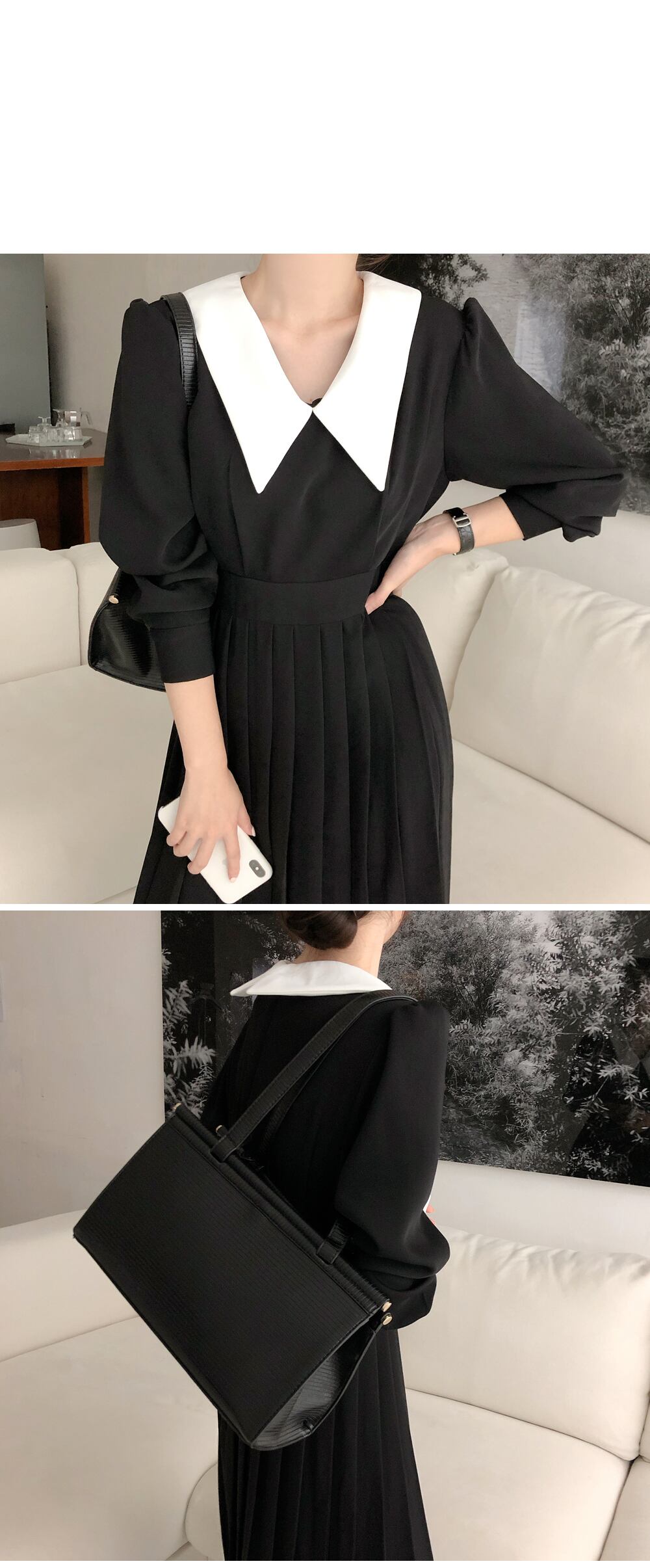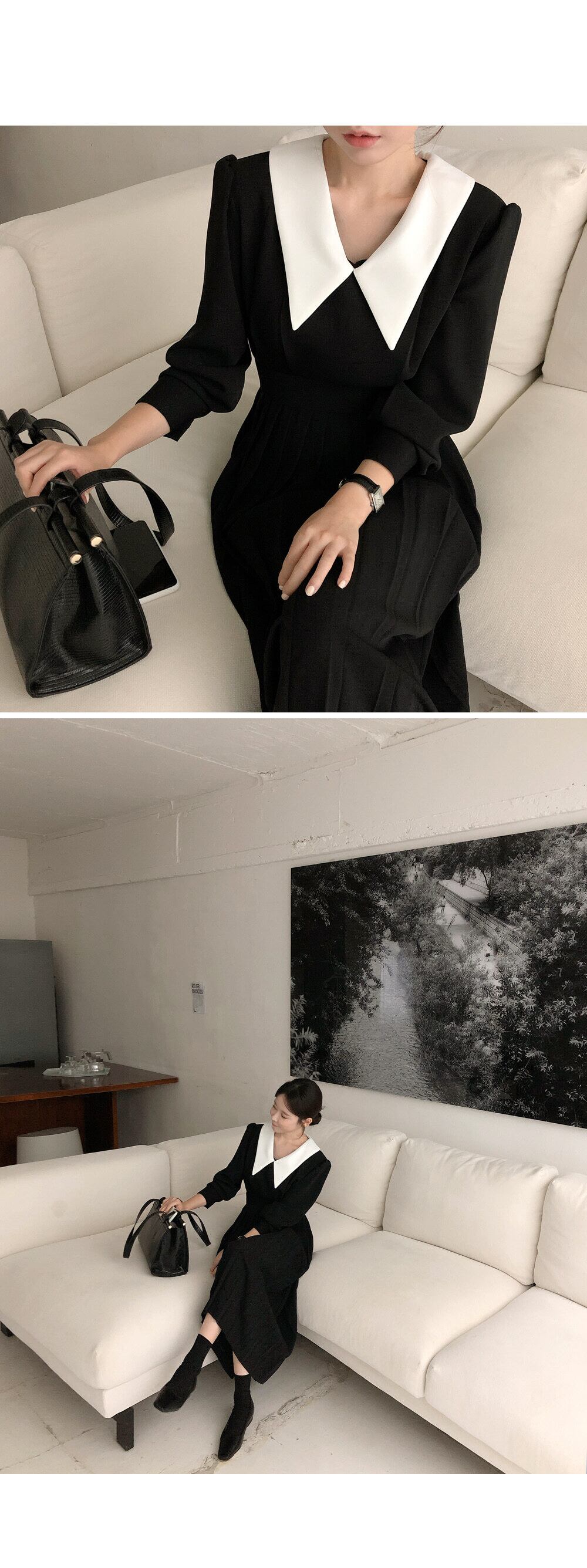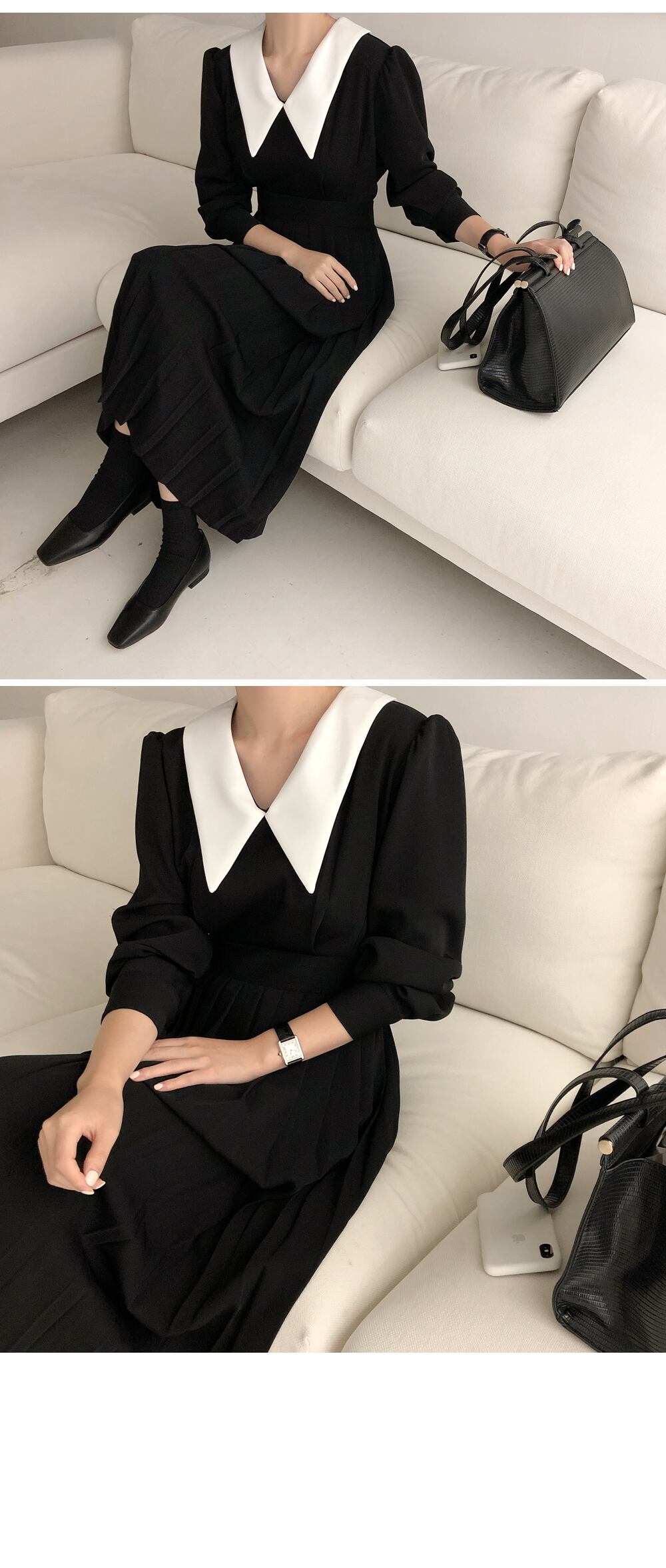 オータムスタイルカラー薄手ウェスト長袖スリーブプリーツドレス ブラック ロング 秋物 ステッチ ICC_レディース27027175932