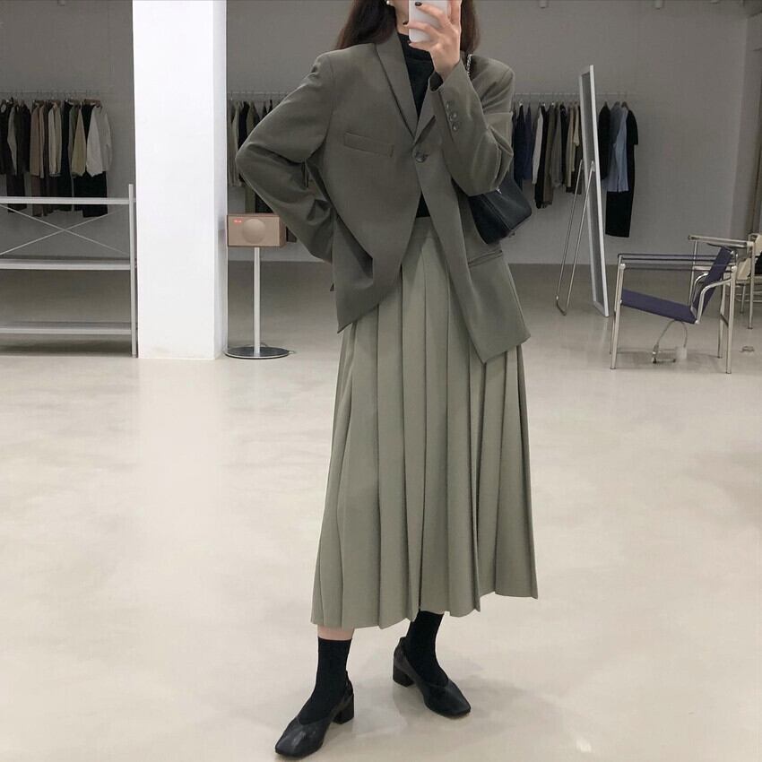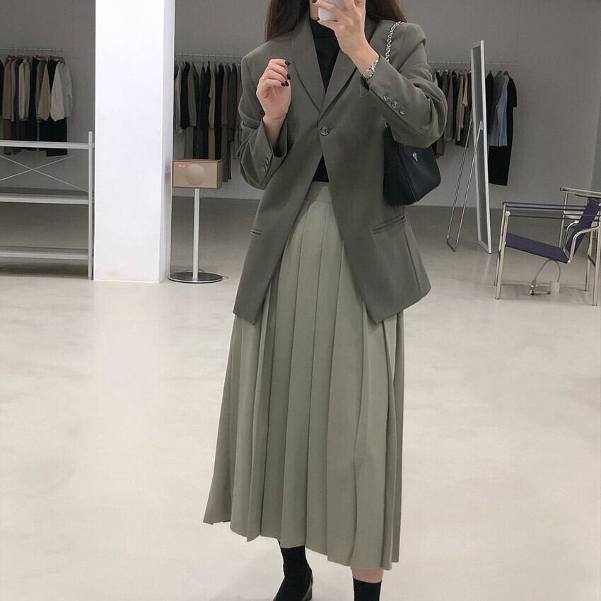 オータムスタンダードカーディガンジャケット ハイウェストウェストソリッド カラープリーツスカート レディース レトロ 秋物 ソリッドカラー ICC_レディース66603811361